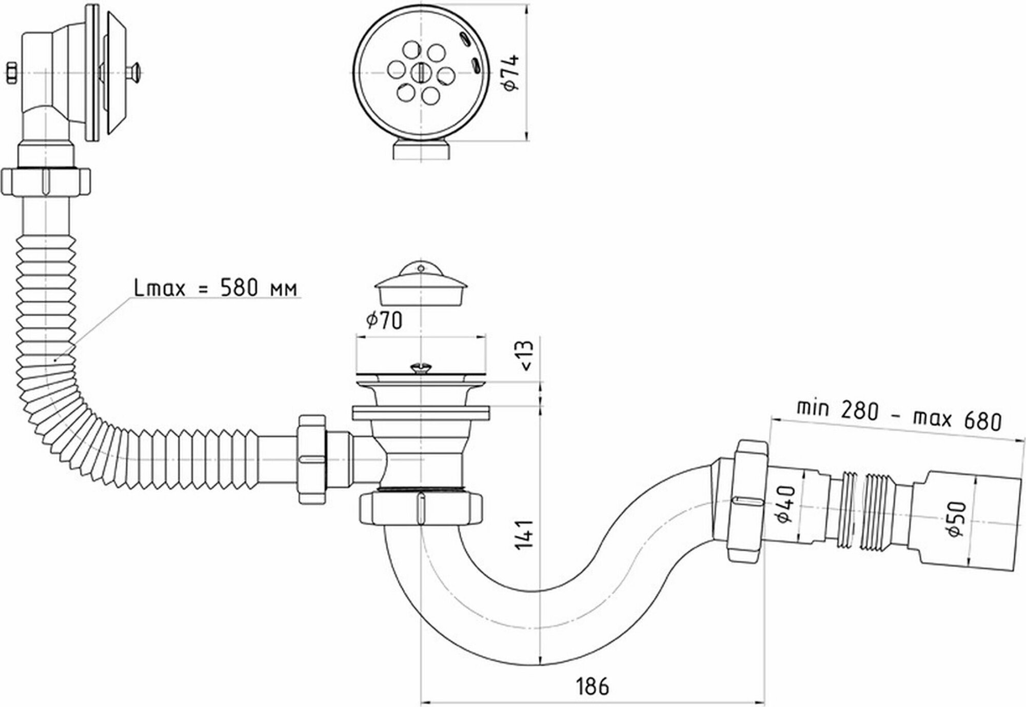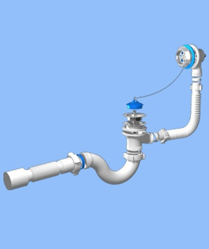 Сифон для ванны прямоточного (проточного, трубного) типа с переливом. Решетки выпуска и перелива изготовлены из нержавеющей стали.