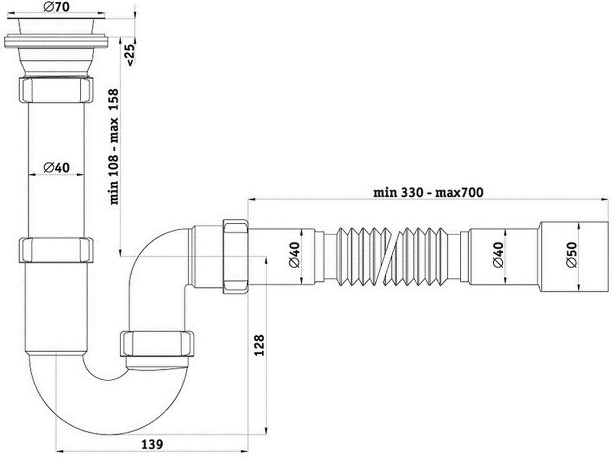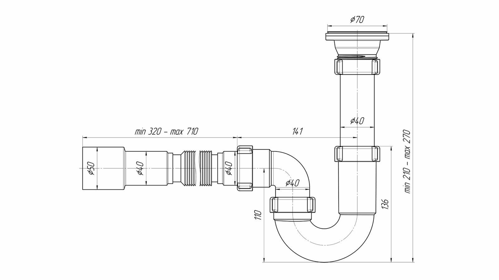 Сифон для кухонной мойки прямоточного (проточного, трубного) типа. С разборным выпуском и решеткой из нержавеющей стали. Для подключения к канализации комплектуется гибкой трубой 40х40/50 мм L 320-710 мм.