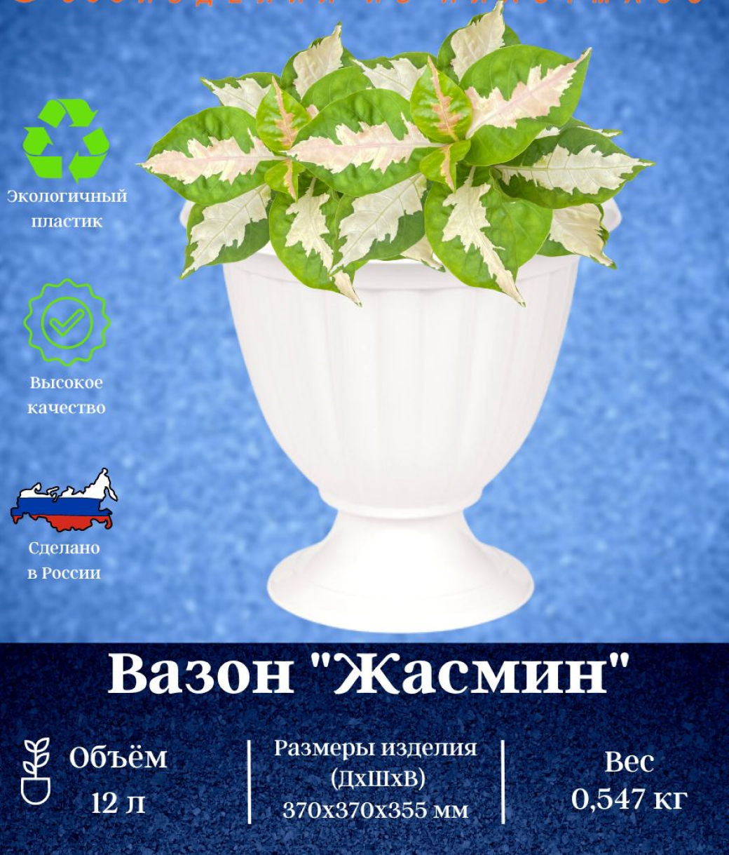 Любой, даже самый современный и продуманный интерьер будет не завершенным без растений. Они не только очищают воздух и насыщают его кислородом, но и заметно украшают окружающее пространство. Такому полезному члену семьи просто необходимо красивое и функциональное кашпо, оригинальный горшок или необычная ваза! Предлагаем - Вазон Жасмин, на высокой ножке! Оптимальный выбор материала - это пластмасса! С легкостью переносите горшки и кашпо с места на место, ставьте их на столики или полки, подвешивайте под потолок, не беспокоясь о нагрузке. Простота ухода. Пластиковые изделия не нуждаются в специальных условиях хранения. Их легко чистить достаточно просто сполоснуть теплой водой. Никаких царапин. Пластиковые кашпо не царапают и не загрязняют поверхности, на которых стоят. Пластик дольше хранит влагу, а значит растение реже нуждается в поливе. Пластмасса не пропускает воздух корневой системе растения не грозят резкие перепады температур.