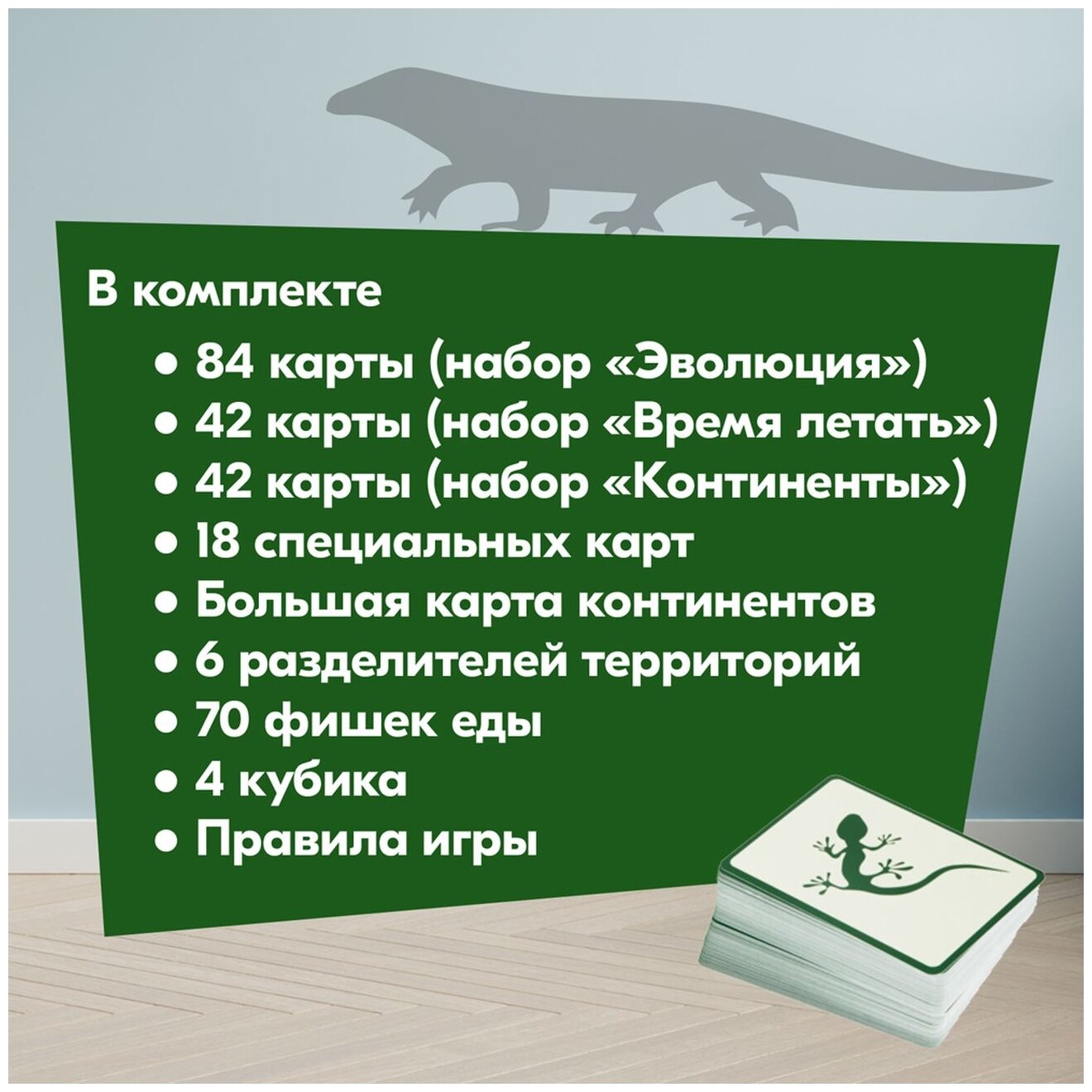 | Комплектация | - 84 карты("Эволюция");- 42 карты("Эволюциявремя летать");- 42 карты("Эволюцияконтиненты");- 18 специальных карт;- 3 карточки континентов;- 4 разделителя территорий;- 62 фишки еды;- 4 кубика;- правила игры. |