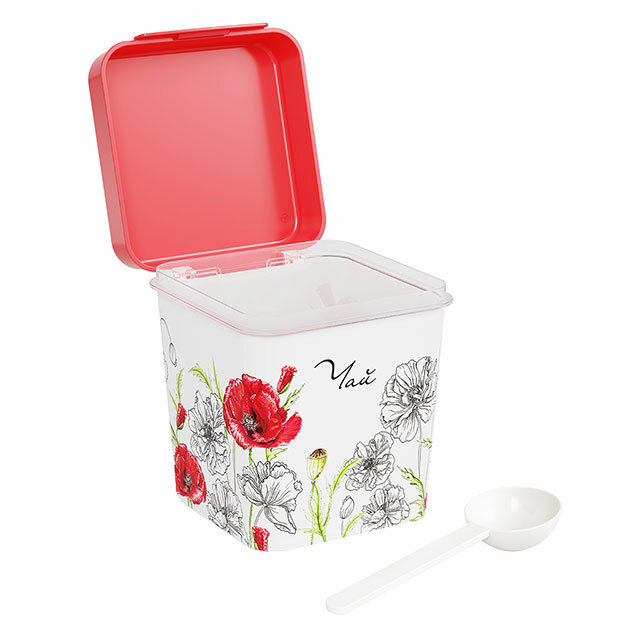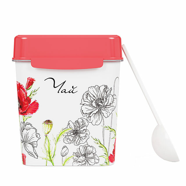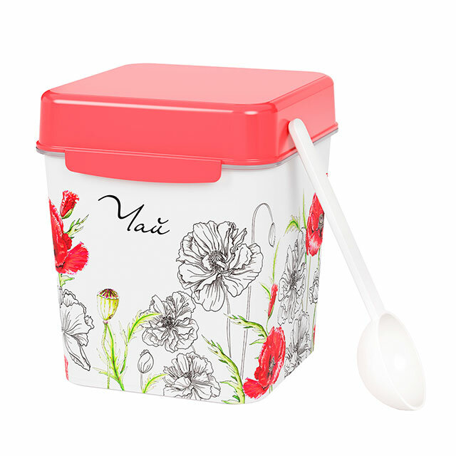 Квадратная ёмкость с откидной крышкой предназначена для хранения наиболее востребованных сыпучих продуктов: чая, сахара и соли. Яркий рисунок нанесен на изделие при помощи технологии IML, он не стирается и не повреждается в процессе эксплуатации. Декор дарит особый колорит изделию и создает определенную стилистику кухни. Тематическая надпись на рисунке сообщает о том, что находится внутри ёмкости. Мерная ложка в комплекте с ёмкостью добавляет изделию удобство использования.