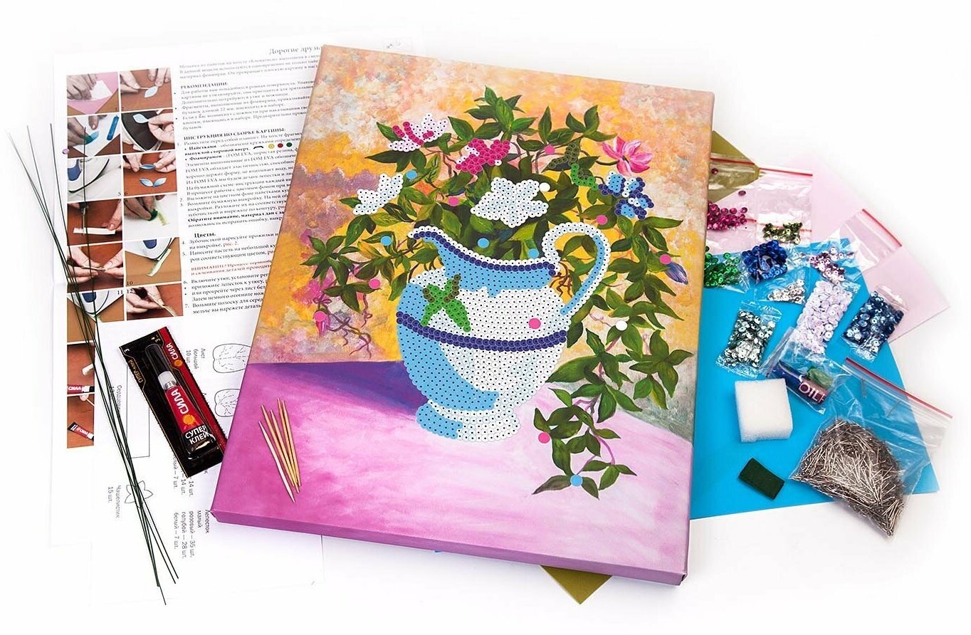 | Состав набора | Холст с напечатанной схемой, натянутый на подрамник,Пайетки 9 цветов,Проволока,Листы FOM EVA (фоамирана) различных цветов,Клей |