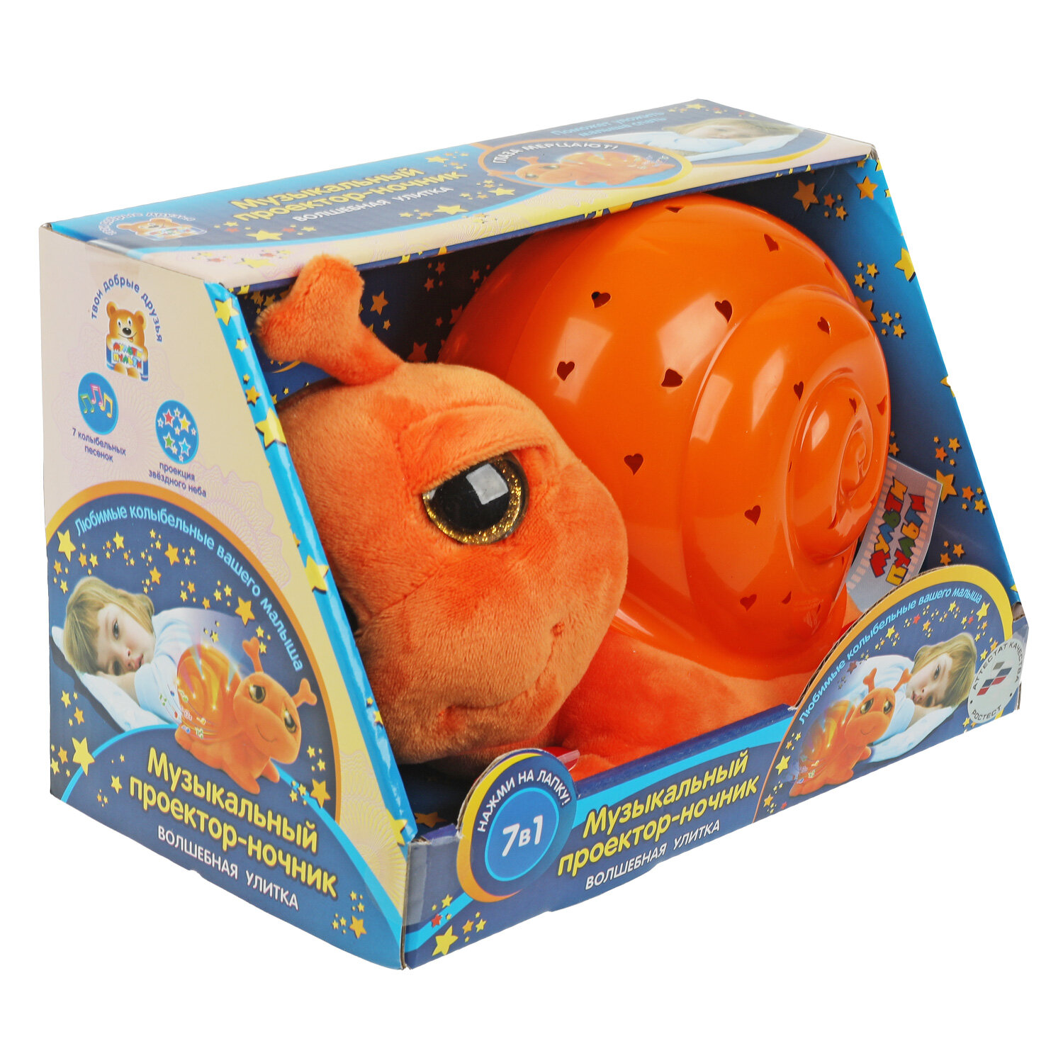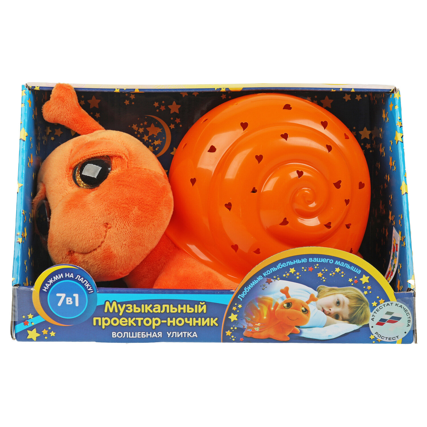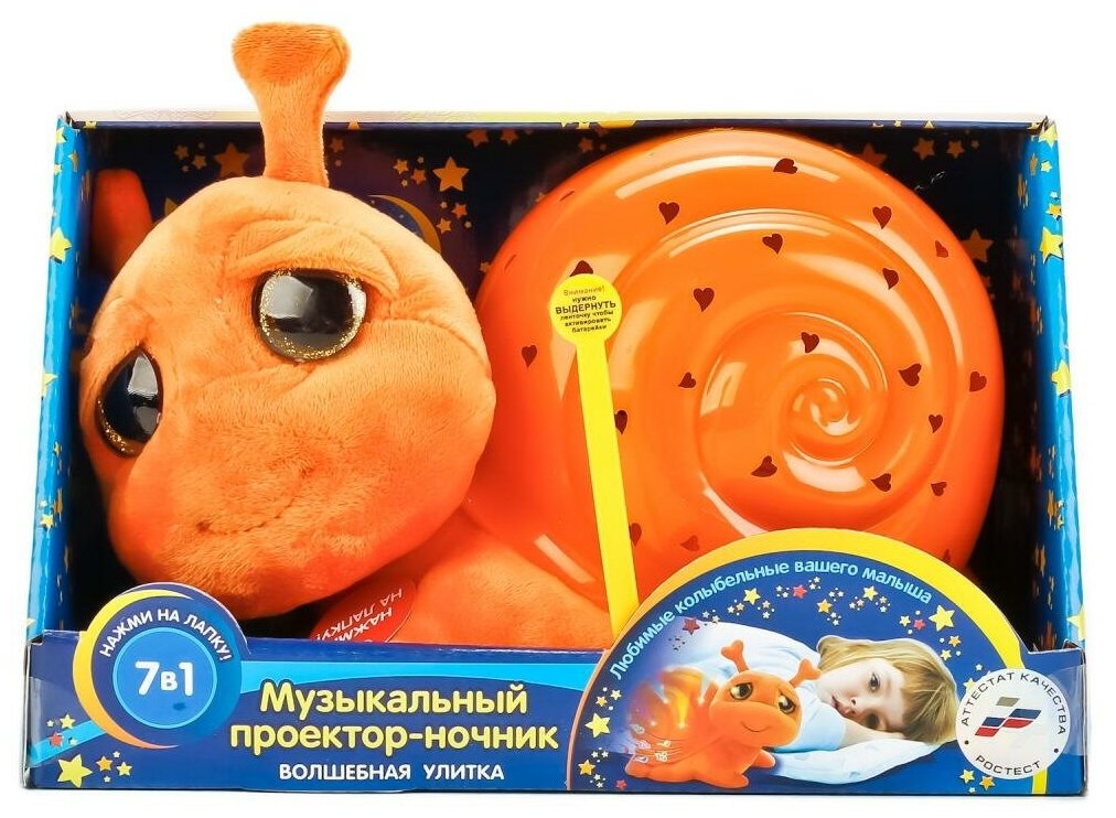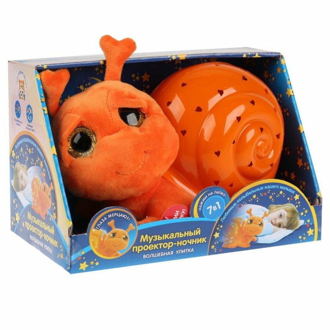 Мягкая игрушка, выполненная в виде очаровательной улитки, домик которой выполняет функцию ночника-проектора, приведет в восторг Вашего кроху. Нажав на лапку новой игрушки, ребенок увидит, как его комната озарится волшебным светом, темнота отступит, а на стенах и потолке заиграет красивый узор из сердечек. Встроенный звуковой модуль воспроизведет 7 колыбельных песенок.