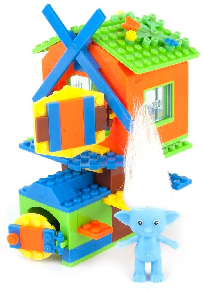 В наборе представлены детали ярких цветов, окрашенные стойкими к истиранию безопасными красителями. Следуя инструкции, дети смогут правильно соединить их друг с другом, чтобы получилась единая игровая конструкция. Композиция представляет собой миниатюрный домик на дереве с открывающейся дверцей и окошками. Снаружи конструкция украшена декоративными цветочками и ветрилом мельницы. Роль главного героя игры будет выполнять фигурка забавного Тролля с длинными мягкими волосами, напоминающая персонажа популярного детского мультфильма Тролли. Собранная композиция станет основой для увлекательной сюжетной игры, в ходе которой можно размещать героя в домике, а другие подробности развлечения дети придумают сами, проявив таким образом фантазию. Также в процессе сборки конструктора ребенок улучшает пространственное мышление и мелкую моторику рук. Детали достаточно просто соединить друг с другом, ведь на их корпусе предусмотрены удобные блочные крепления. Пластиковые детали устойчивы к деформациям и ударам, так как изготовлены из прочного материла высокого качества. В комплекте 216 деталей и фигурка. рекомендовано детям от 6 лет.