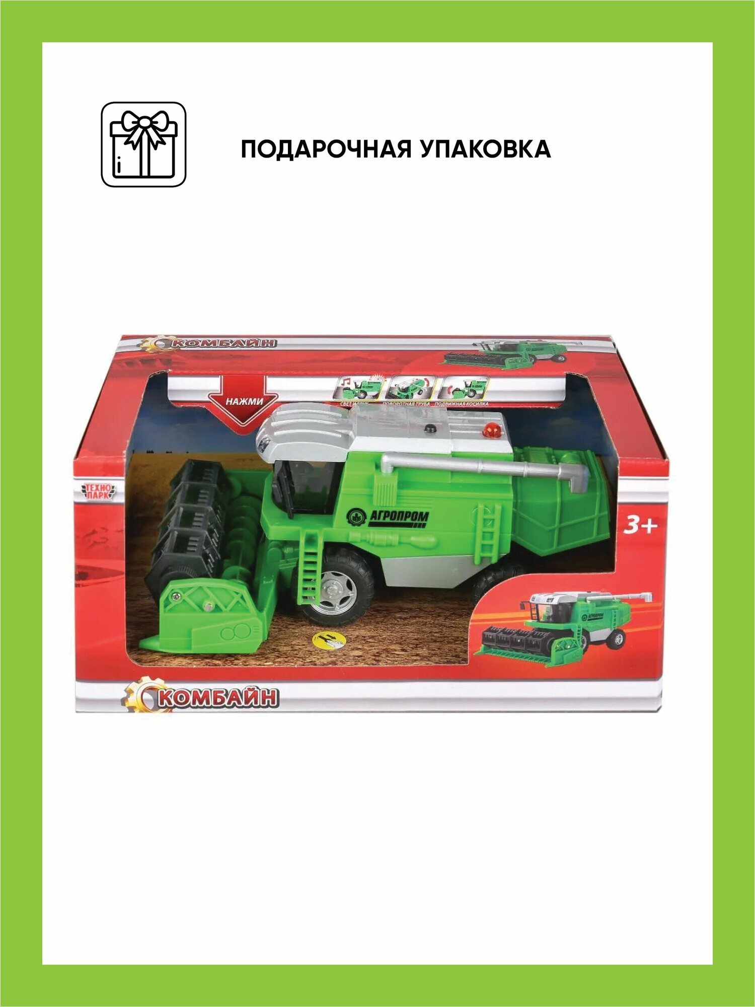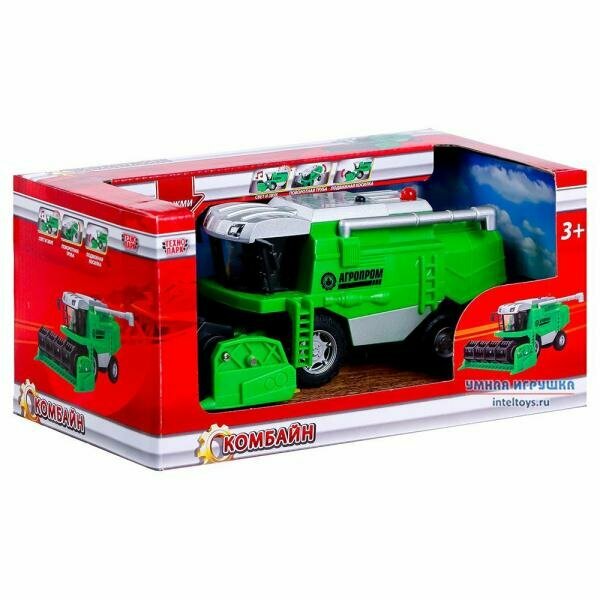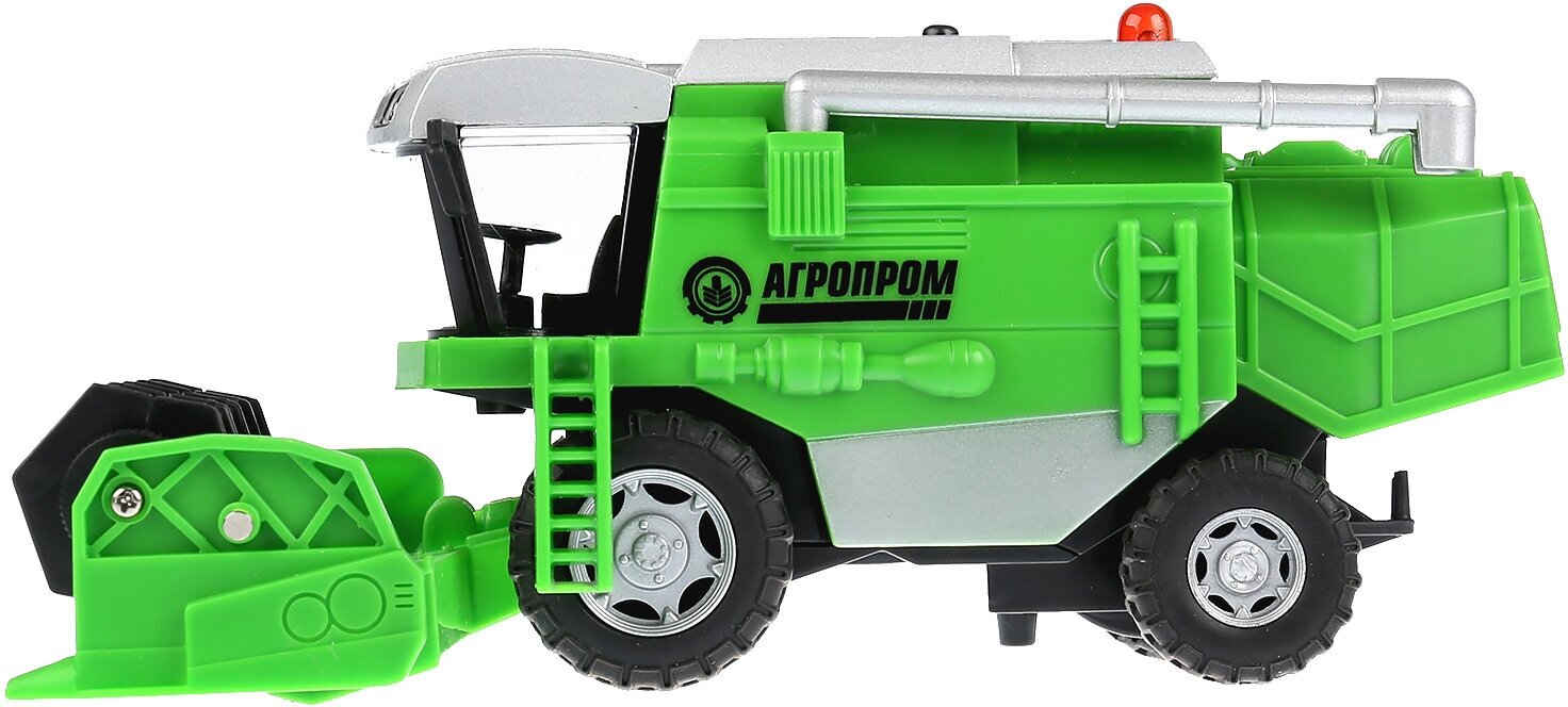 Игрушечный комбайн Агропром станет отличным атрибутом для сюжетных игр или экспонатом для школьного проекта. Миниатюрная копия специализированной сельскохозяйственной техники выполнена с тщательной проработкой всех деталей и напоминает настоящую машину. Сквозь прозрачную кабину можно разглядеть рабочее место комбайнера. Игрушка оснащена световыми и звуковыми эффектами, придающими игре динамизм и реалистичность. При нажатии на кнопку раздается звук работающего мотора, фары и оранжевый сигнальный маячок на крыше начинают светиться. Игрушка имеет подвижные детали - колеса крутятся, труба сбоку поворачивается, косилка для сбора урожая вращается.