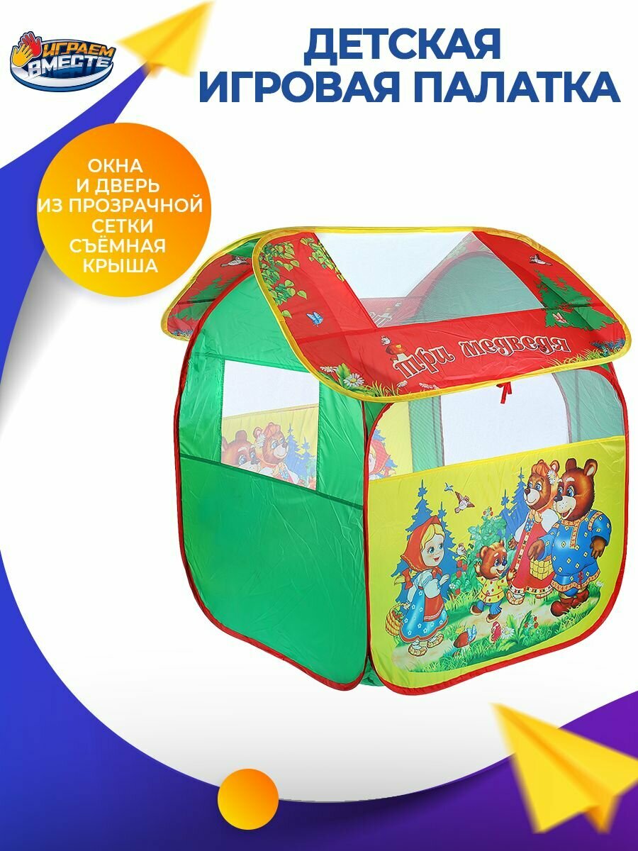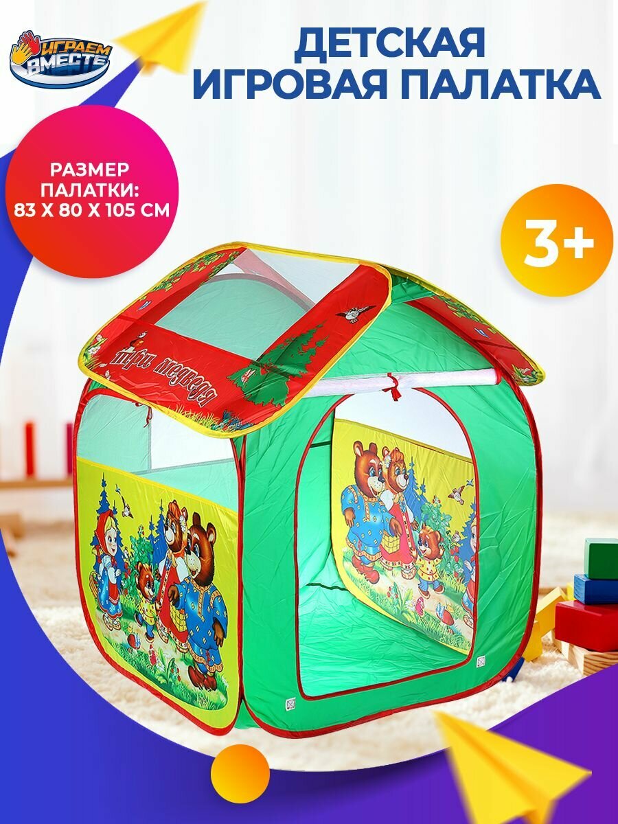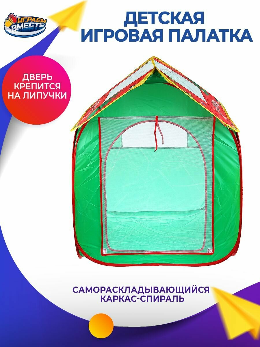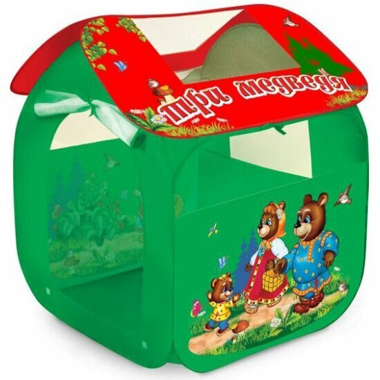 Детская игровая палатка изготовлена из качественного текстиля, который можно стирать. Палатка легко устанавливается, а после игры также просто складывается. Каркас палатки позволяет изделию держать форму. Этот игрушечный домик оснащен сеточками в виде окон по бокам стен и на крыше, сеточкой закрыто и входное отверстие. Такие сетчатые вставки позволяют воздуху свободно циркулировать в домике и защищают от насекомых. Детская игровая палатка украшена изображением героев русской народной сказки . Палатка упакована в удобную для транспортировки сумку. Изготовлена из прочного безопасного высококачественного текстиля. Размер в собранном виде 83 х 80 х 105 см. Рекомендовано детям от 3-х лет.
