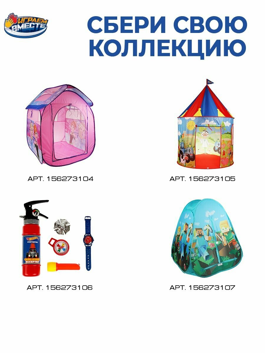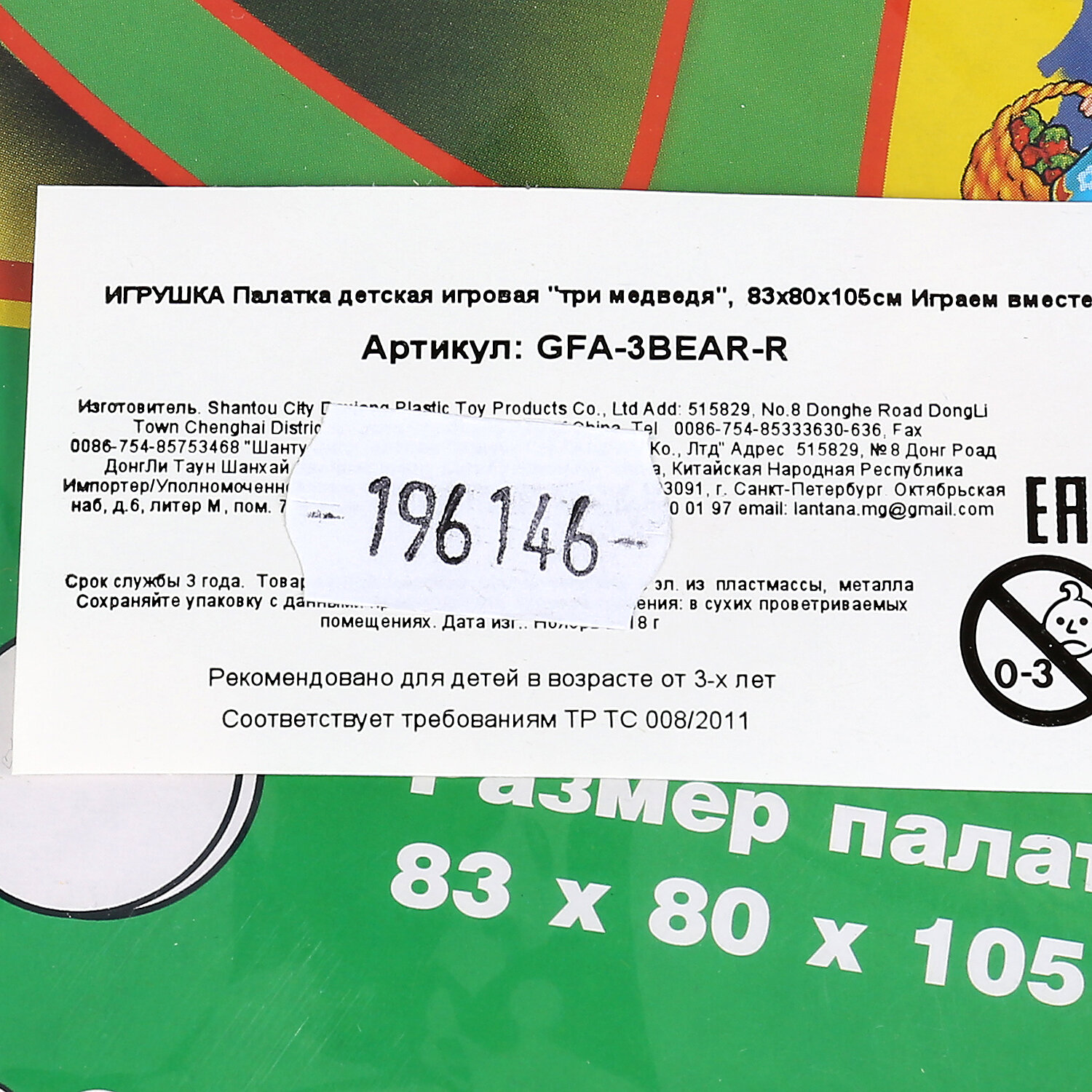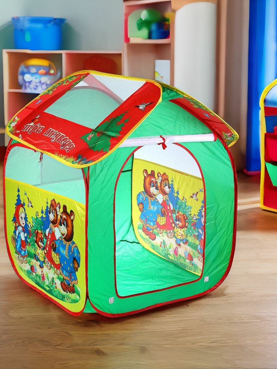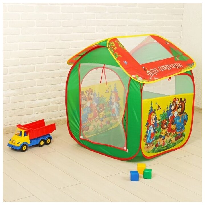 Детская игровая палатка изготовлена из качественного текстиля, который можно стирать. Палатка легко устанавливается, а после игры также просто складывается. Каркас палатки позволяет изделию держать форму. Этот игрушечный домик оснащен сеточками в виде окон по бокам стен и на крыше, сеточкой закрыто и входное отверстие. Такие сетчатые вставки позволяют воздуху свободно циркулировать в домике и защищают от насекомых. Детская игровая палатка украшена изображением героев русской народной сказки . Палатка упакована в удобную для транспортировки сумку. Изготовлена из прочного безопасного высококачественного текстиля. Размер в собранном виде 83 х 80 х 105 см. Рекомендовано детям от 3-х лет.