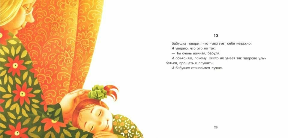 Очень долго ждала эту книгу, и вот она появилась, правда, в другом оформлении. Предыдущая мне нравилась больше - иллюстрации 22 современных художников дорогого стоят... Здесь же художник один - и не мой... Но история настолько светлая, добрая, трогательная. Миллион эмоций: от радости, что у моей дочки есть бабушка и до светлой грусти, что моя улетела... Покупать, читать, вспоминать, ценить и как минимум позвонить бабушке.