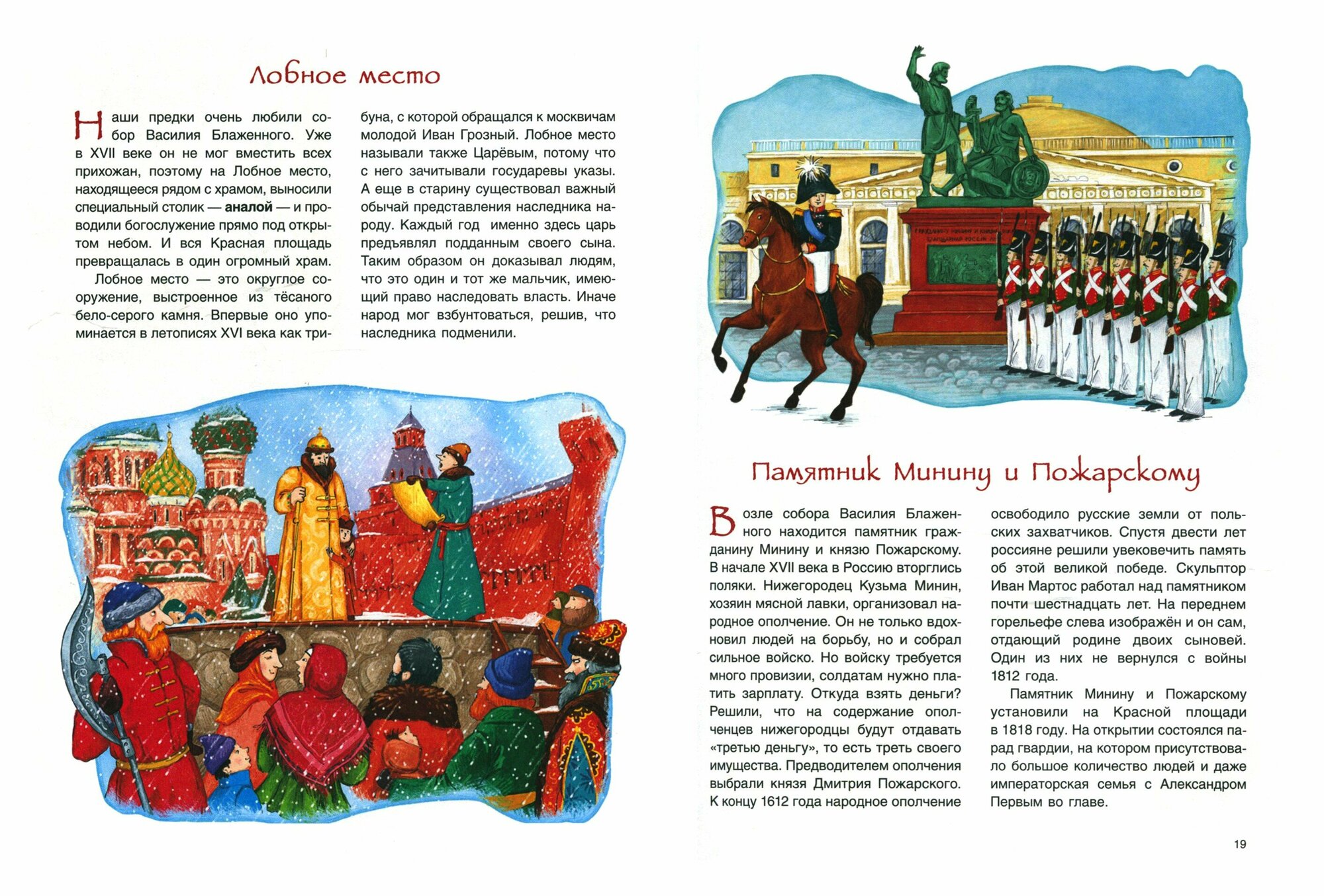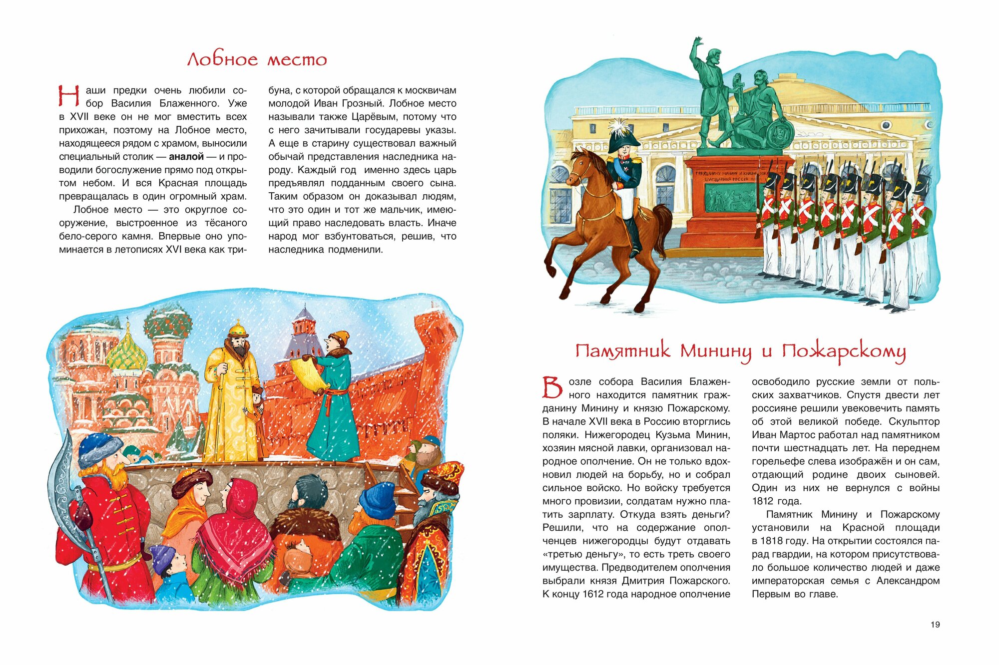 Очень познавательная книга даже для москвичей! Много информации, которую просто так не узнаешь - и про то, что было на месте Красной площади, и про башни кремля, и про памятники и другие здания на площади. Понравились иллюстрации: очень веселые персонажи, но при этом совершенно как есть нарисованы и храм Василия Блаженного со всеми куполами, и башни!