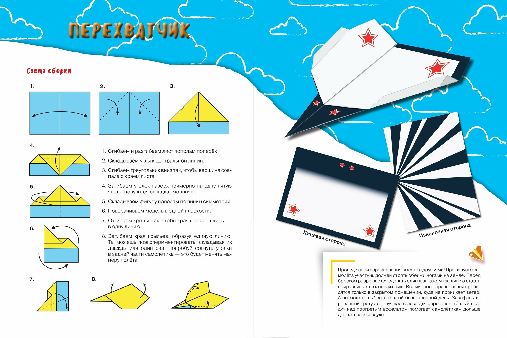 Эта книга - настоящий набор для оригами! В ней вы найдете подробные схемы и листы для складывания восьми самых легких, красивых и отлично летающий самолетов. Вы узнаете много интересного об искусстве оригами, о необычных самолетах, а также получите практические советы по техникам складывания и броска, которые помогут выиграть любые аэрогонки!