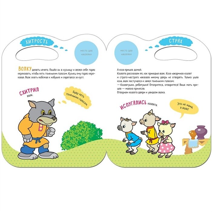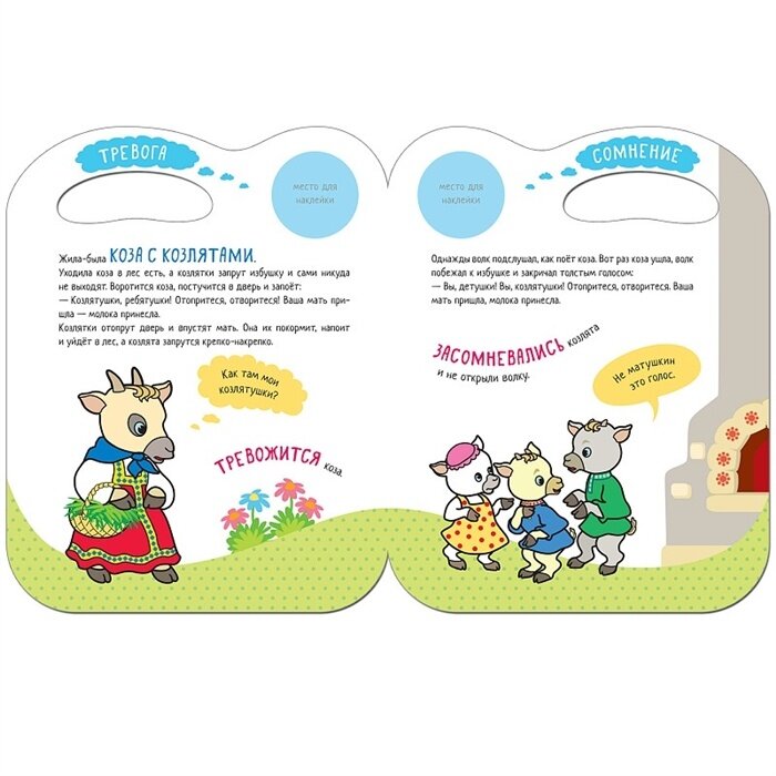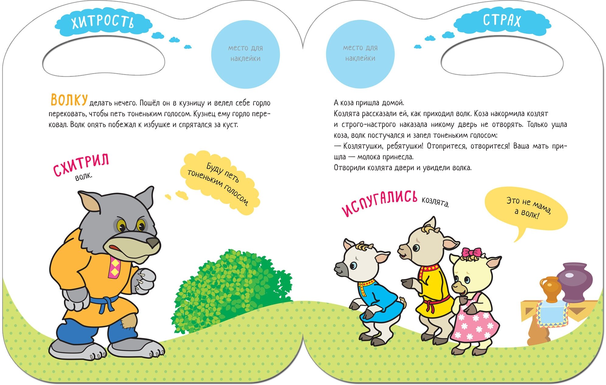 Эта яркая книжка с наклейками познакомит ребенка с радостью, грустью и другими эмоциями. В этом ему поможет любимая русская народная сказка «Волк и козлята».