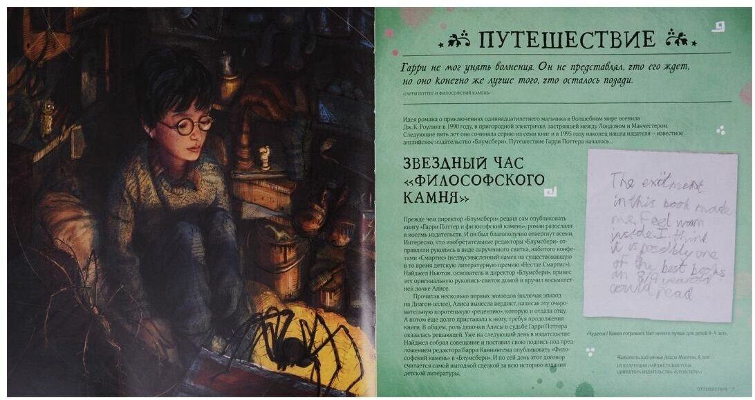 "Путешествие в историю волшебства" это замечательно! Определённо, все поклонники вселенной "Поттерианы" в каждой стране ожидали выхода чего-нибудь совершенно потрясающего к двадцатилетнему юбилею. Из всех подарочных изданий эта книга отличается в первую очередь ценой, все остальные схожие книги стоят от двух тысяч и выше (абсолютный чемпион это четырёх килограммовый фолиант "Мир волшебства", стоимостью 6 тысяч), здесь же поклонникам предоставлен некий "лайтовый" вариант, но от этого ни в коем случае не менее интересный. В этом издании есть всего два минуса: во-первых, исходя из небольшой цены, сразу ясно что издании будет не такое "праздничное". Страниц здесь меньше двух сотен, а обложка обычная мягкая, переплёт совершенно простой, даже не интегральный. Ну, а во-вторых, книга издательства "МАХАОН", что сразу же говорит более чем достаточно всем адекватным поклонникам. Купила и сижу калякаю прямо в книге.