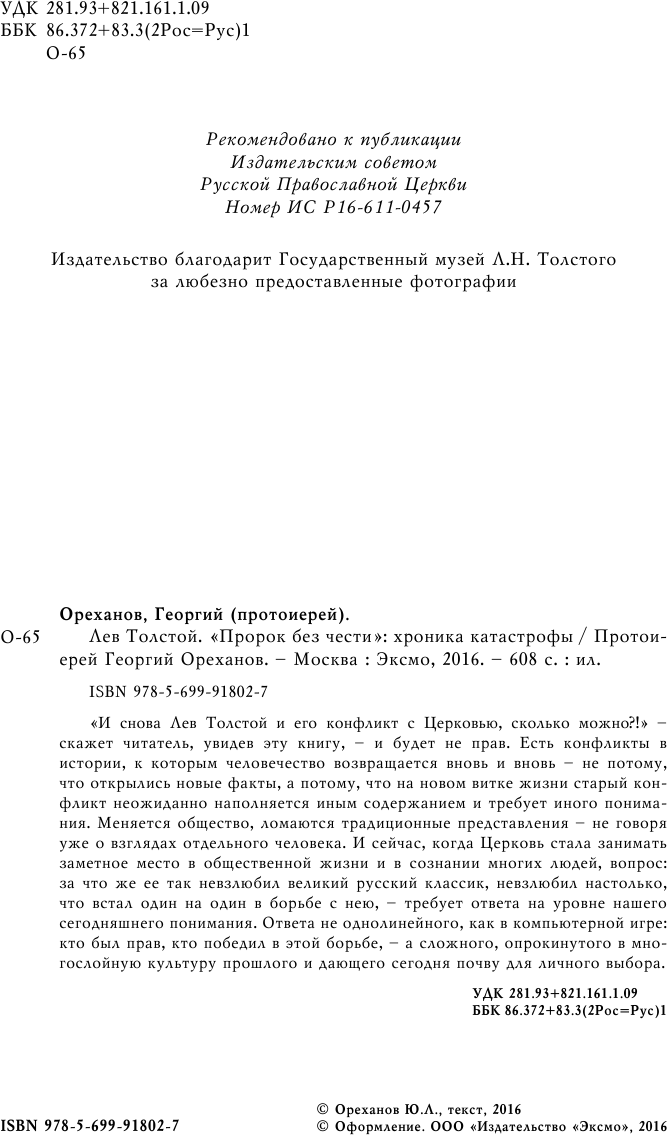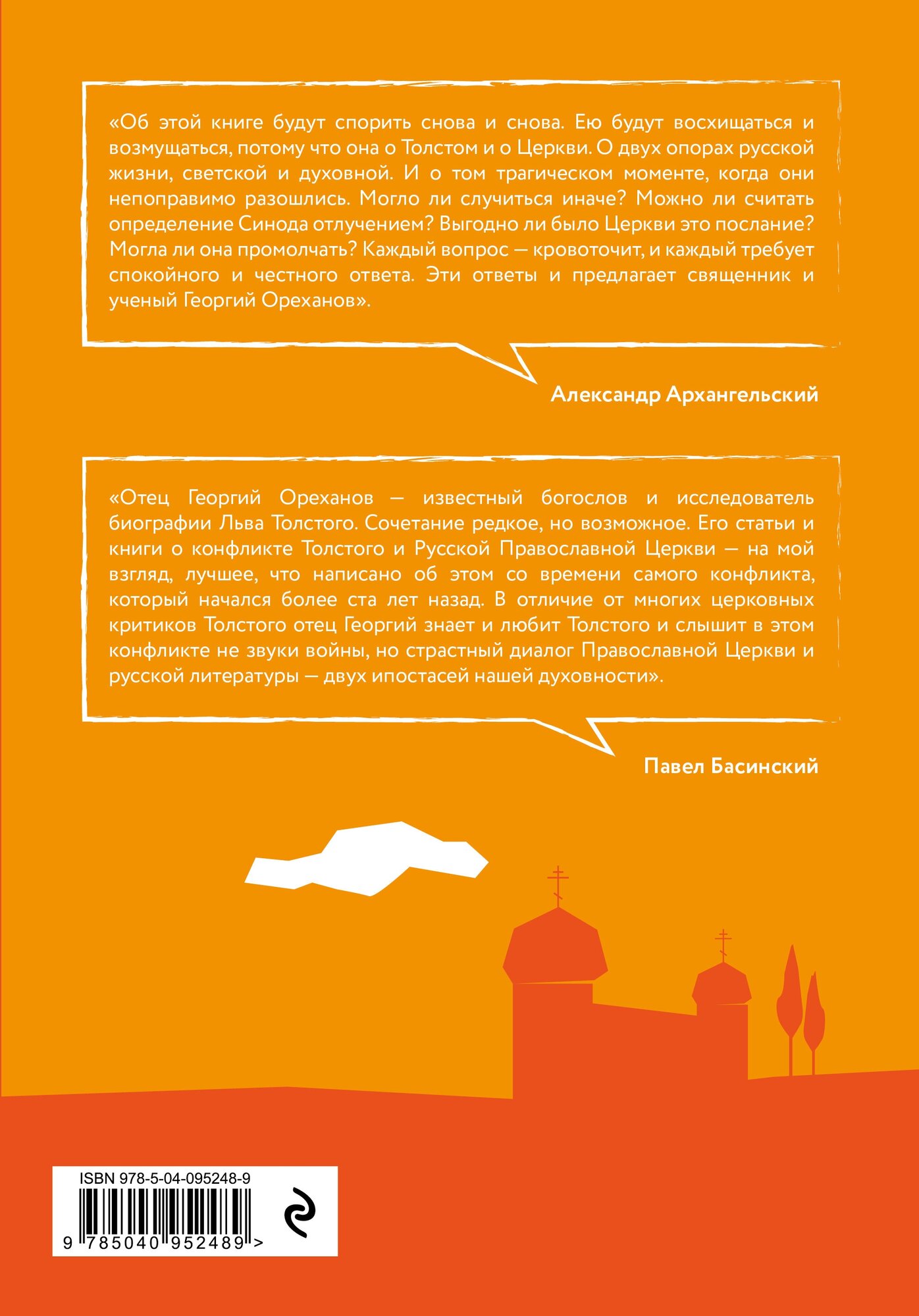 «Об этой книге будут спорить снова и снова. Ею будут восхищаться и возмущаться, потому что она о Толстом и о Церкви. О двух опорах русской жизни, светской и духовной. И о том трагическом моменте, когда они непоправимо разошлись. Могло ли случиться иначе? Можно ли считать определение Синода отлучением? Выгодно ли было Церкви это послание? Могла ли она промолчать? Каждый вопрос – кровоточит, и каждый требует спокойного и честного ответа. Эти ответы и предлагает священник и ученый Георгий Ореханов». - Александр Архангельский