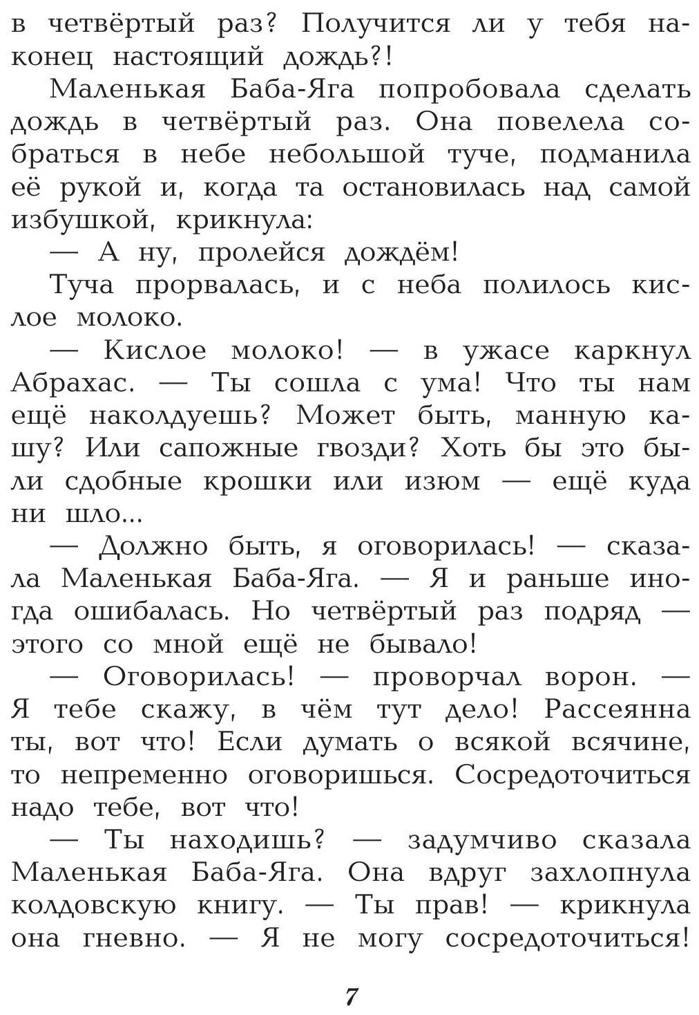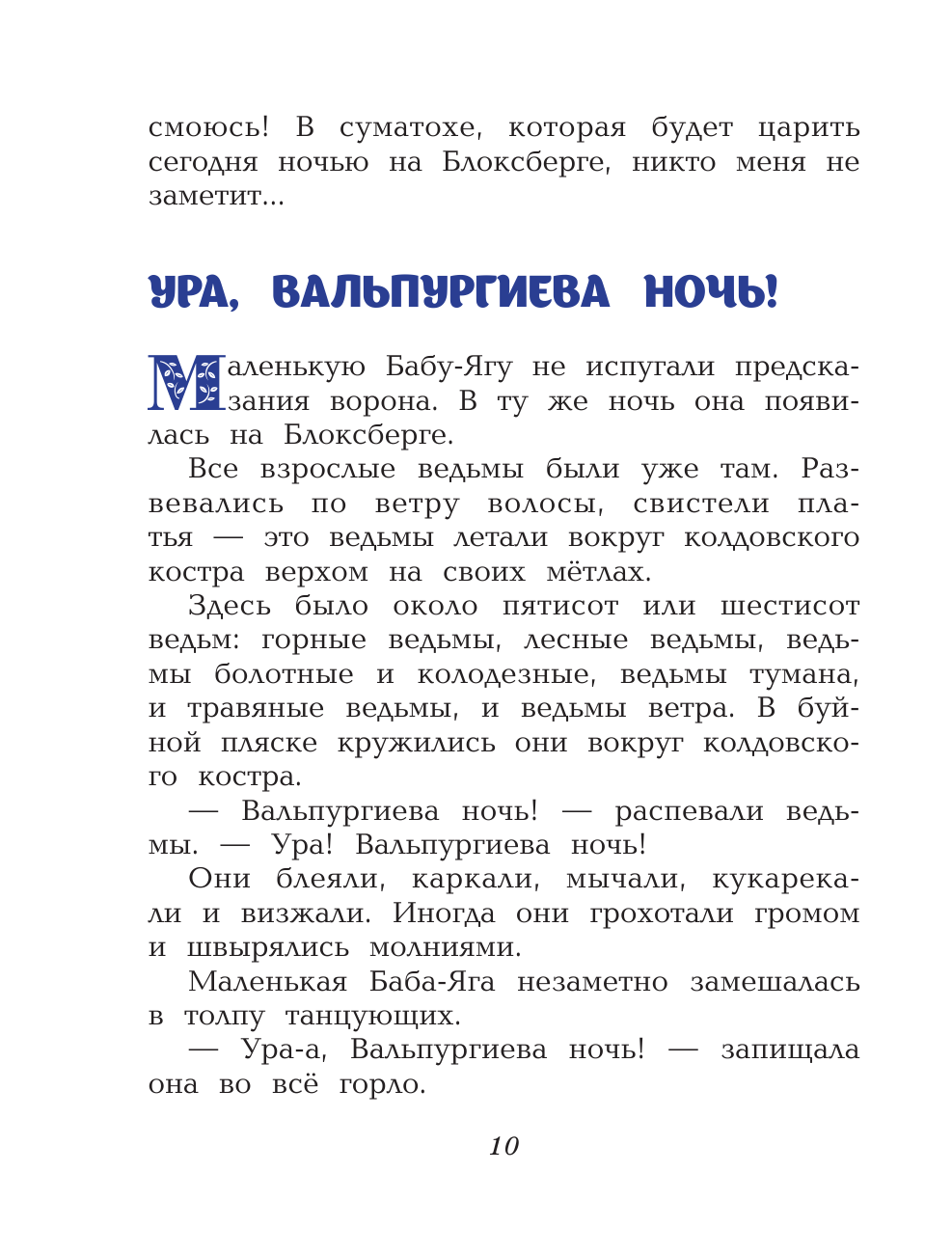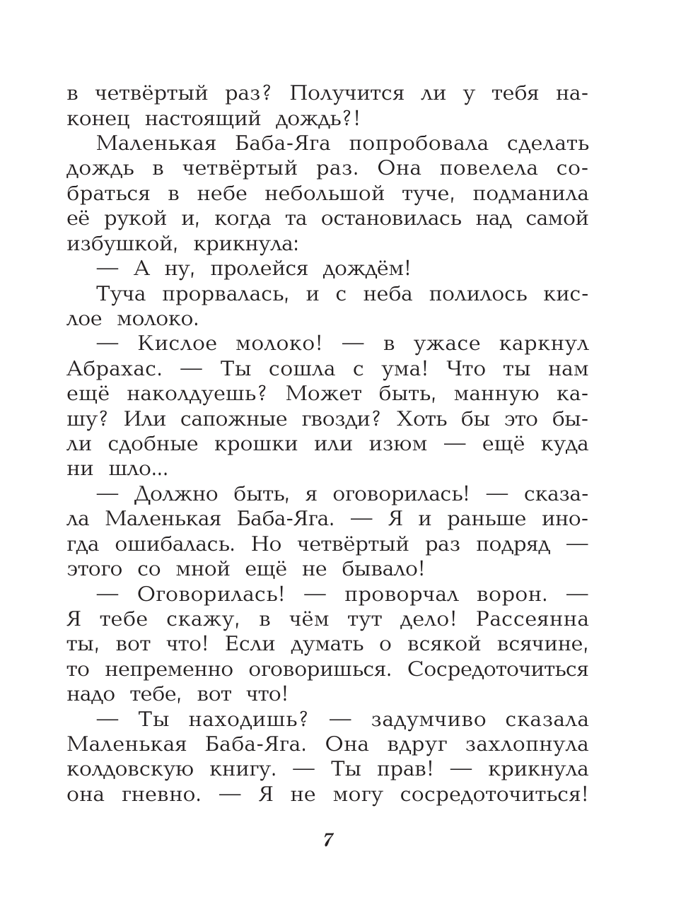 Эта сказочная повесть про маленькую Бабу Ягу, которой всего 127 лет. Она очень хотела попасть на праздник Вальпургиевой ночи, но так как колдовать она не умела, ей пришлось туда прокрасться в тайне ото всех. Главная ведьма поймала ее и отправила учиться колдовать, чтобы через год сдать экзамен. Вместе с вороном Абрахом, они совершают добрые дела, помогают старикам, детям и животным. Другие ведьмы пришли в ужас от ее поступков, ведь ее задача была- всем вредить. Но маленькой Бабе Яге удалось проучить зло, она сожгла все волшебные книги и метлы и осталась единственной колдуньей на земле. Эта очень добрая и светлая сказка, покажет детям, как легко добро побеждает зло, а настоящую дружбу ничем не испортишь.