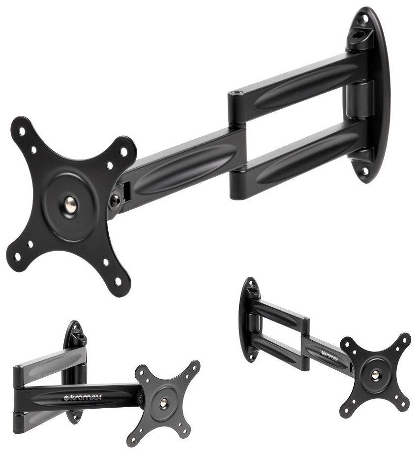 Кронштейн для ТВ KROMAX подходит для настенной установки телевизоров, поддерживающих стандарт VESA от 75x75 до 100x100. Кронштейн подойдет для эксплуатации совместно с телевизорами, диагональ которых варьируется от 10 до 32 дюймов. Кронштейн имеет конструкцию, которая регулируется в широких пределах: угол поворота достигает 180°, угол наклона вверх – 90°, а угол наклона вниз – 90°. Расстояние от стены может регулироваться в пределах от 75 до 455 мм.