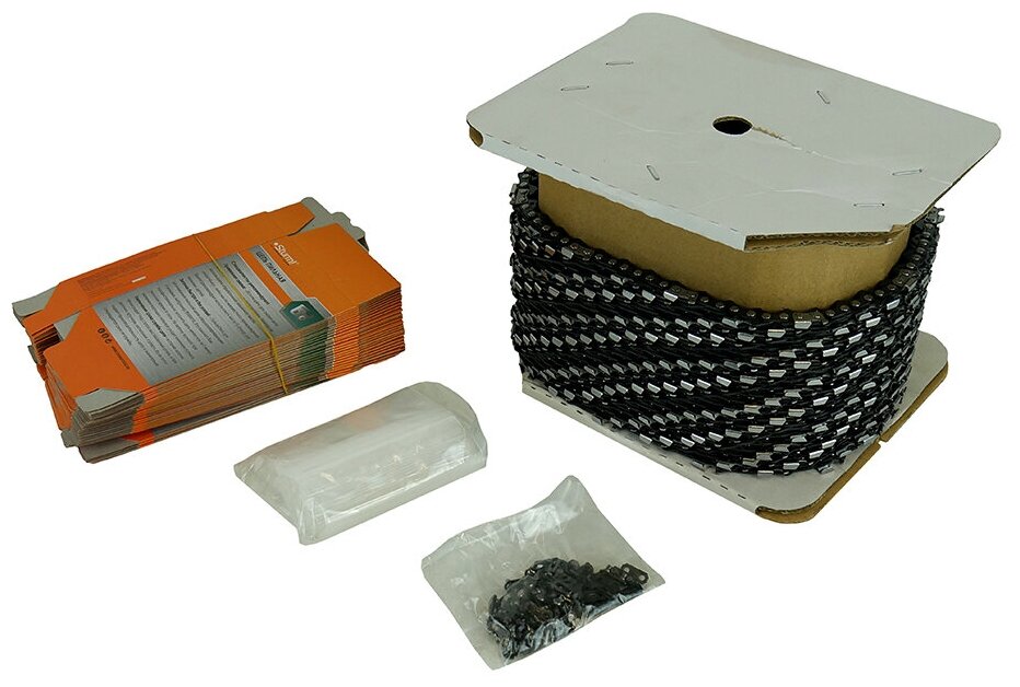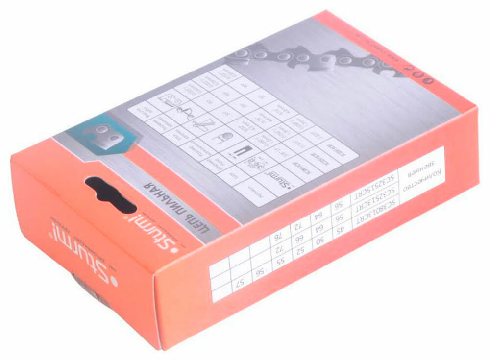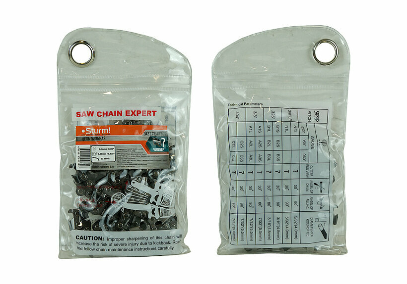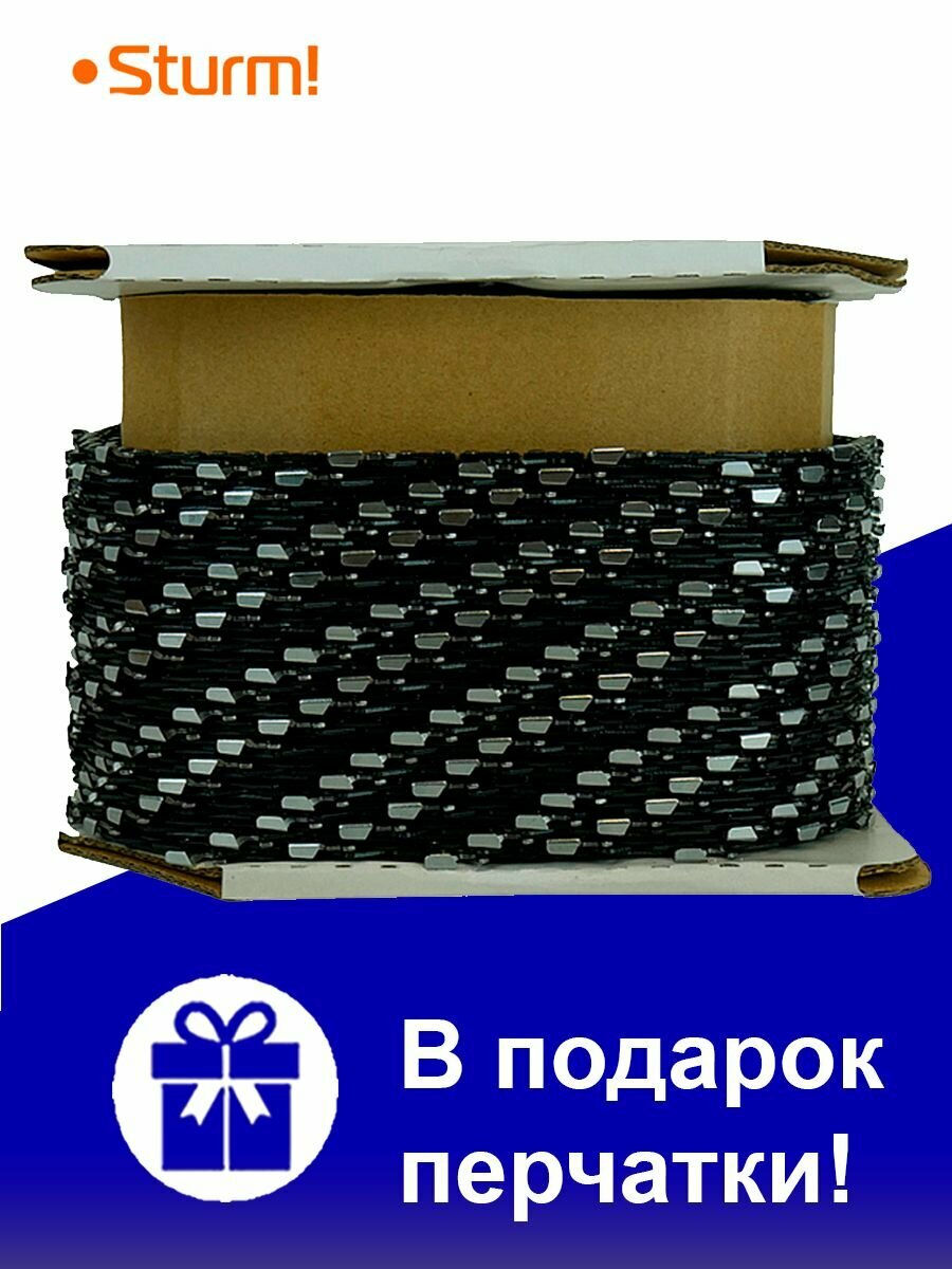 Цепь для пилы Sturm поставляется в бухте, состоящей из 1848 звеньев. Благодаря этому покупатель может самостоятельно выбрать нужную длину для шины своего устройства.