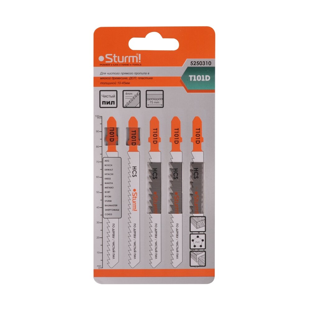 | Наименование модели | 5250310 Пилки для лобзика Sturm! T101D 5шт прям.чист.рез,10-45мм,мяг.древ.ДСП, пласт. |