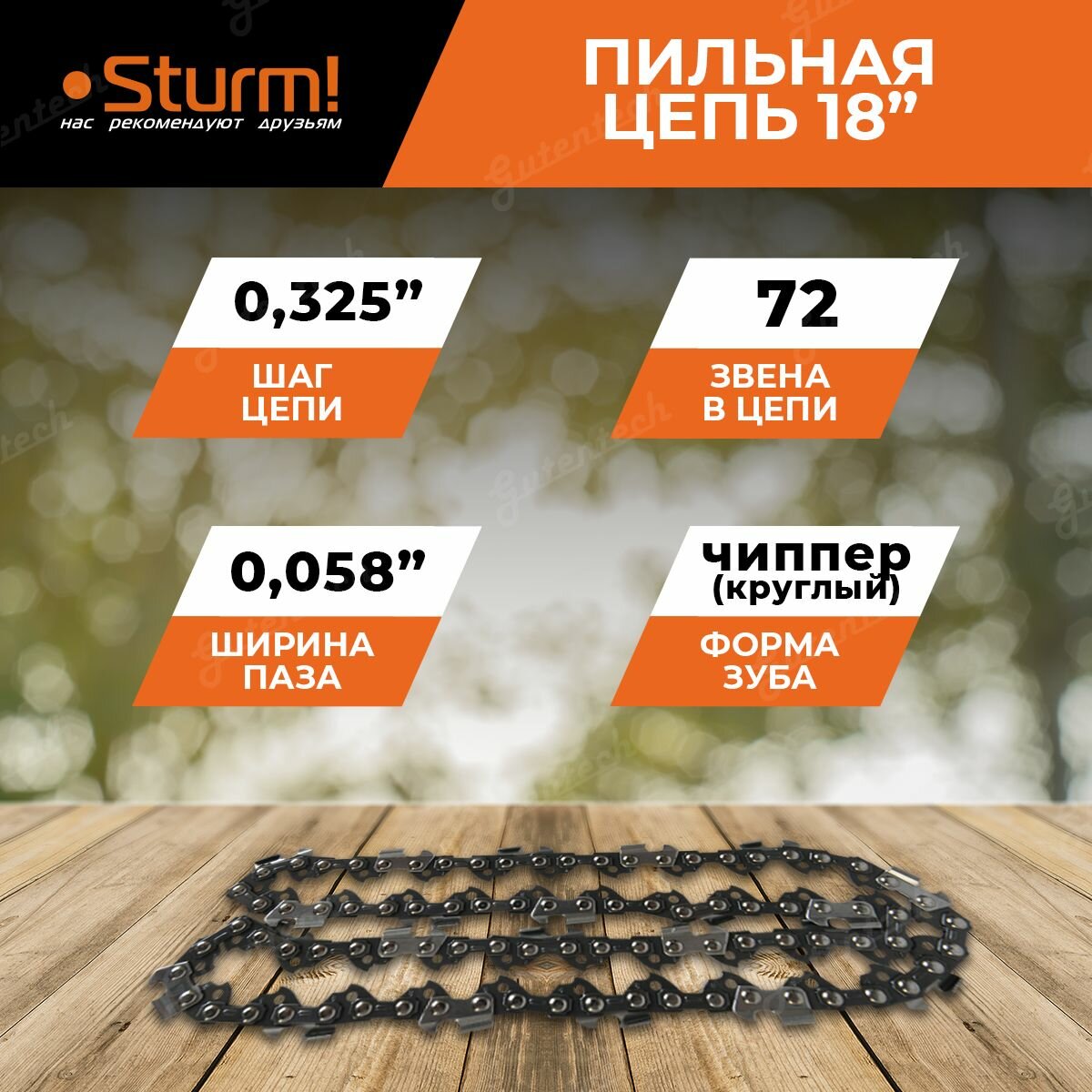 Цепь для цепной пилы Sturm - обладает малыми вибрациями и низким уровнем шума. Круглый зуб шириной 0,058 и шагом цепи 0,325 дает очень хорошие результаты при роботе с продуктом.
