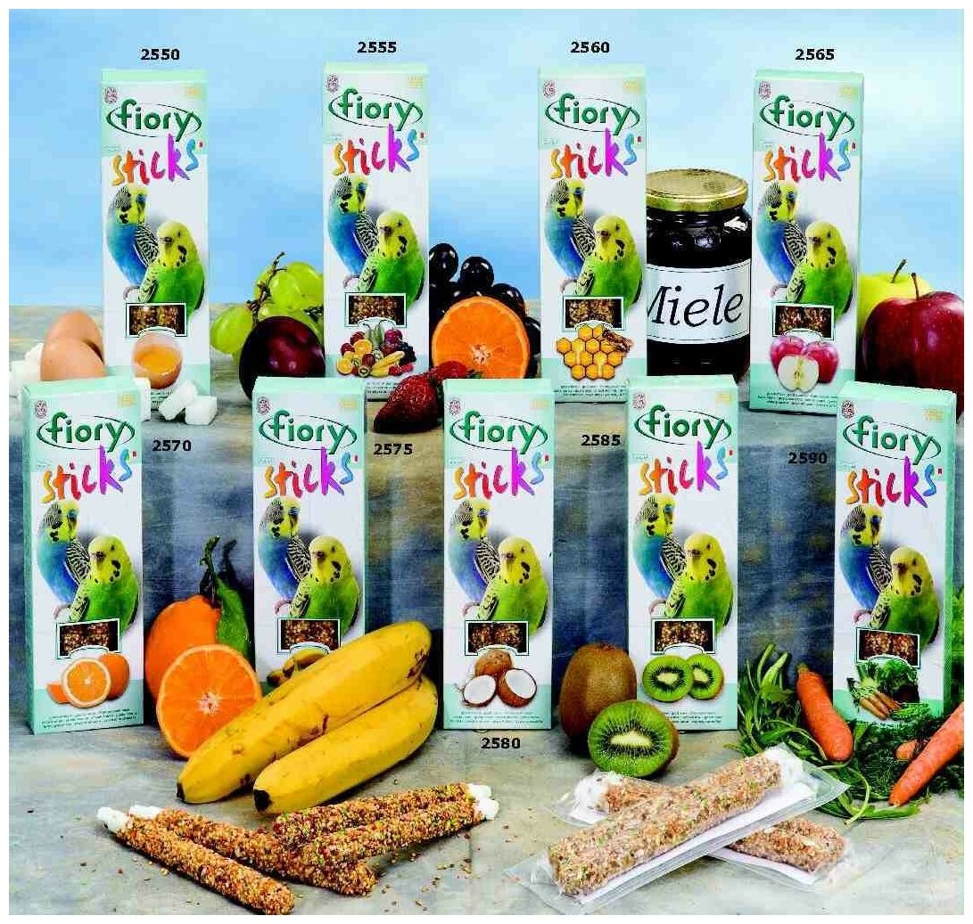 Палочки с девятью различными элементами, среди которых есть семена сафлора, слегка маслянистого по составу (полезен при запорах, а также используется для улучшения пигментации оперения птиц). Клейкий элемент особенно вкусен, позволяет птицам легко его клевать, не раскалывая их на части и не разбрасывая крошки по дну клетки. Поскольку продукт отличается высоким содержанием белка, им не следует злоупотреблять. Как и все подобного рода дополнительное питание, палочки считаются лакомством и являются добавкой к обычному рациону. Палочки удобны для закрепления в клетке, а попугаю удобно склевывать отдельные семечки, не ломая при этом всю палочку.
