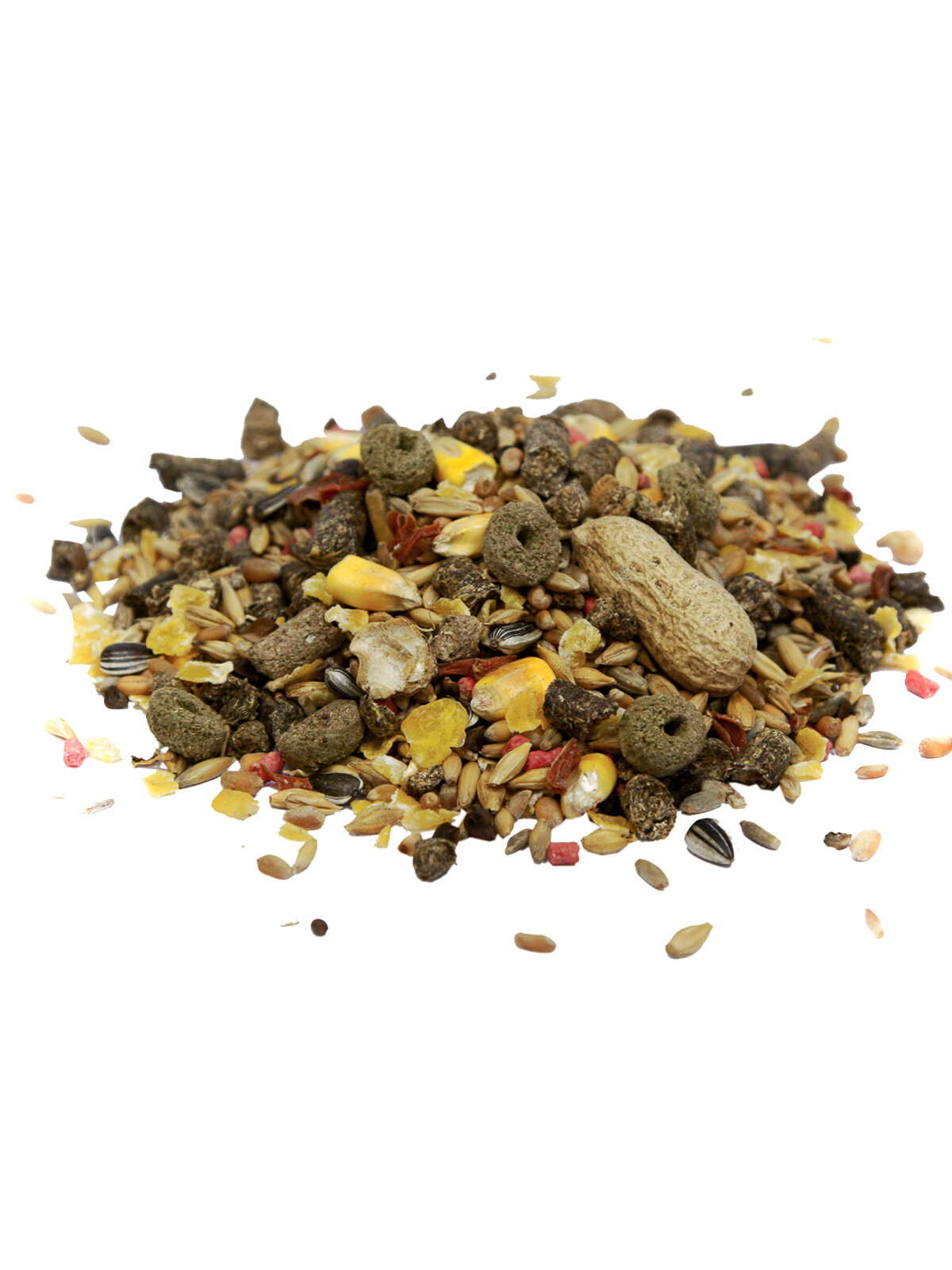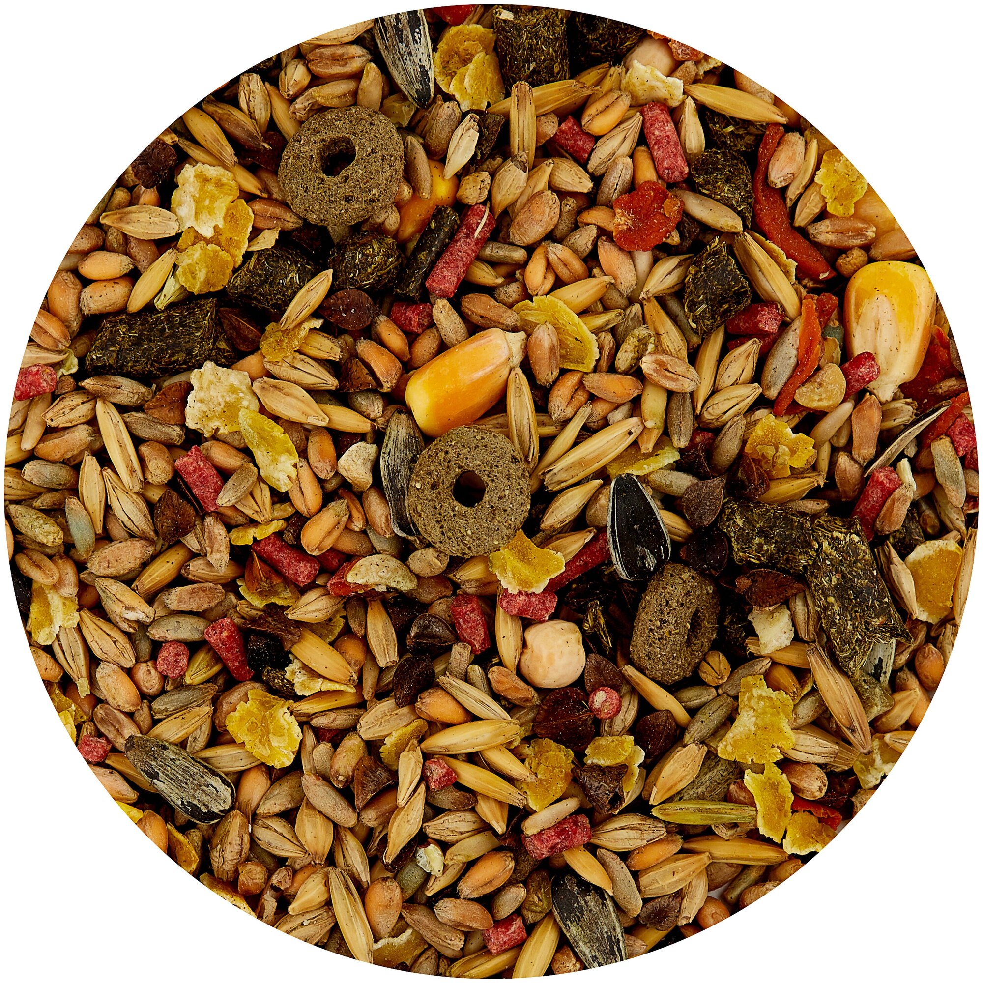 | Состав | Состав: экструдированная люцерна, зерна и зерновые продукты, красные гранулы (пекарные продукты, продукты растительного происхождения, мед 10%, минералы, масла и жиры, фруктовый ароматизатор, красители и консерванты, одобренные EC, инулин, МОС, ФОС, омега 6, бета глюкан, омега3, экстракт юкки Шидигера) 4,4%, кольца (зерна и зерновые продукты, экструдированная люцерна, фураж и отруби и производные продукты, экстракт растительного белка, минералы и производные продукты) 2,2%, горох, семена маслосодержащих фруктов и производные, арахис, сушеная морковь. |