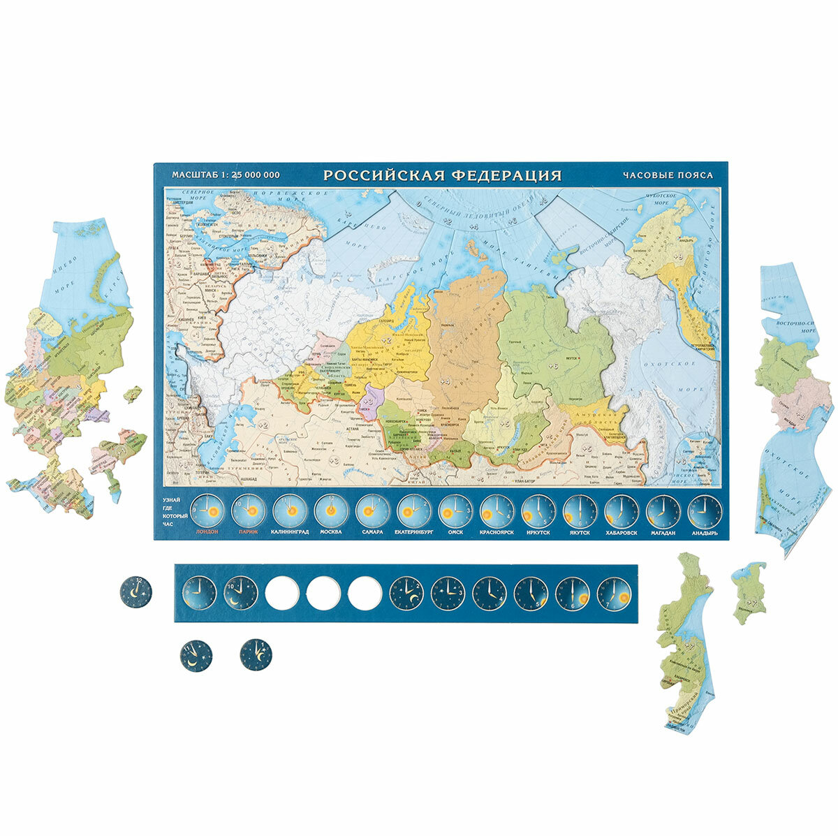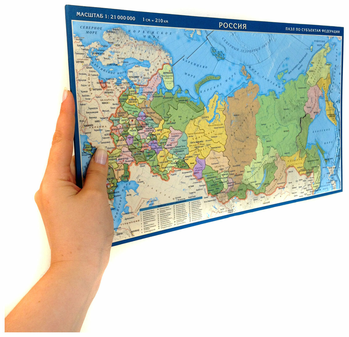 Пазлы были изобретены в Англии в 1761 году лондонским торговцем географическими картами Джоном Спилсберри. Он придумал новое учебное пособие — мозаику-головоломку в виде разрезанной географической карты. Сегодня, претерпев множество изменений, пазлы стали увлекательной игрой. Картографический пазл Россия возвращает нас к истокам — его кусочки вырублены по границам нашей страны, что не только развивают логическое мышление, внимание, память, воображение и мелкую моторику, но и помогают лучше изучить географию. Состоит из 33 деталей.