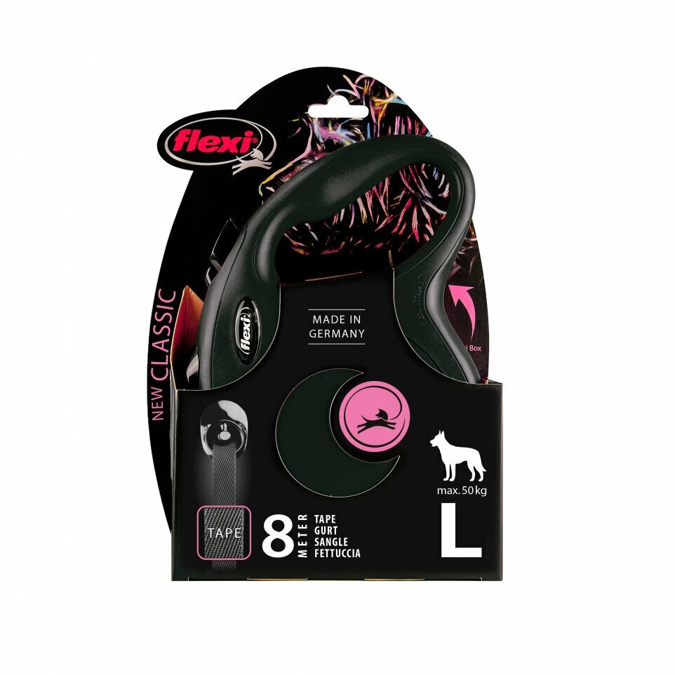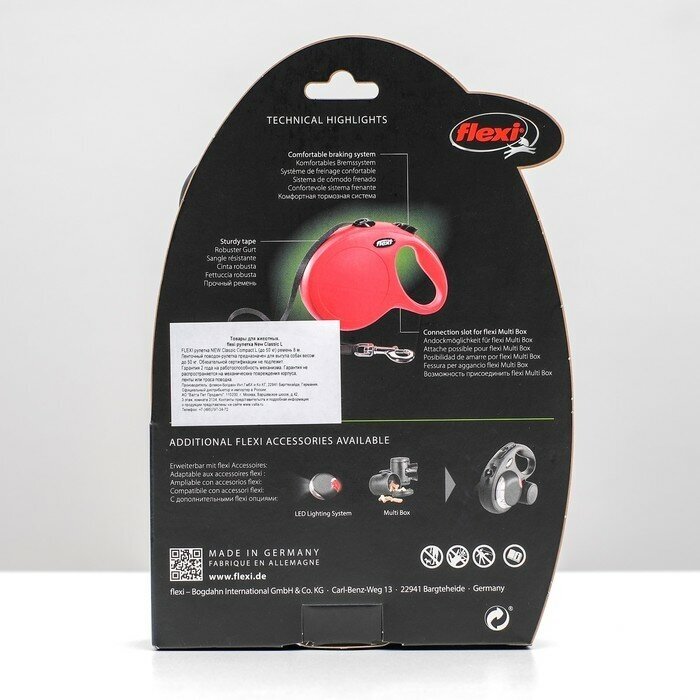 Удобный ленточный поводок-рулетка предназначен для выгула собак весом до 50 кг. Лента поводка автоматически сматывается и поводок в процессе использования не провисает, не касается грунта и таким образом не пачкается и не перетирается. Поводок не нужно подбирать руками когда питомец подошел ближе, таким образом Ваши руки всегда чистые.Рулетки FLEXI производятся в Германии более 40 лет и особое внимание уделяется обеспечению безопасности и комфорта использования: - обновленная эргономичная кнопка системы торможения - запатентованная тормозная система - надежный карабин - светоотражающие элементыЗапатентованая система сматывания и фиксации длины — дополнительное удобство, помогающее контролировать поведение животного.Корпус рулетки выполнен из ударопрочного пластика.Рулетка очень легка в применении, принесет вам еще большую радость от моментов, проведенных с любимцем.