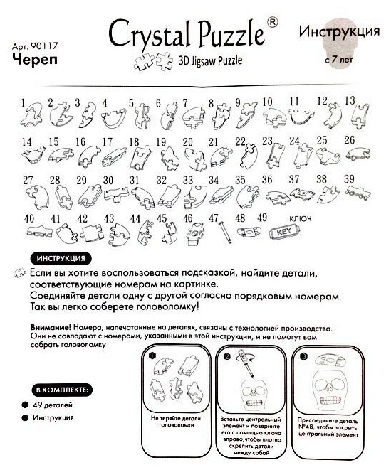 Эта необычная модель Crystal Puzzle привлекает внимание окружающих и радует высокой детализацией. Украшение интерьера, подарок или аксессуар для Хеллоуина – решайте сами, как поступить с готовой фигуркой. Эффектный серебристый череп собирается по слоям из объемных деталей, каждая из которых обладает уникальной формой. 3D-пазлы – это увлекательное занятие для всей семьи. Собирайте модели в трех измерениях, учитесь видеть вещи под необычными углами и развивайте пространственное мышление. Объемные головоломки полезны для детского развития, поэтому их рекомендуют в качестве подарков детям школьного возраста. В наборе уже есть все необходимые детали для сборки, а также инструкция на русском языке.