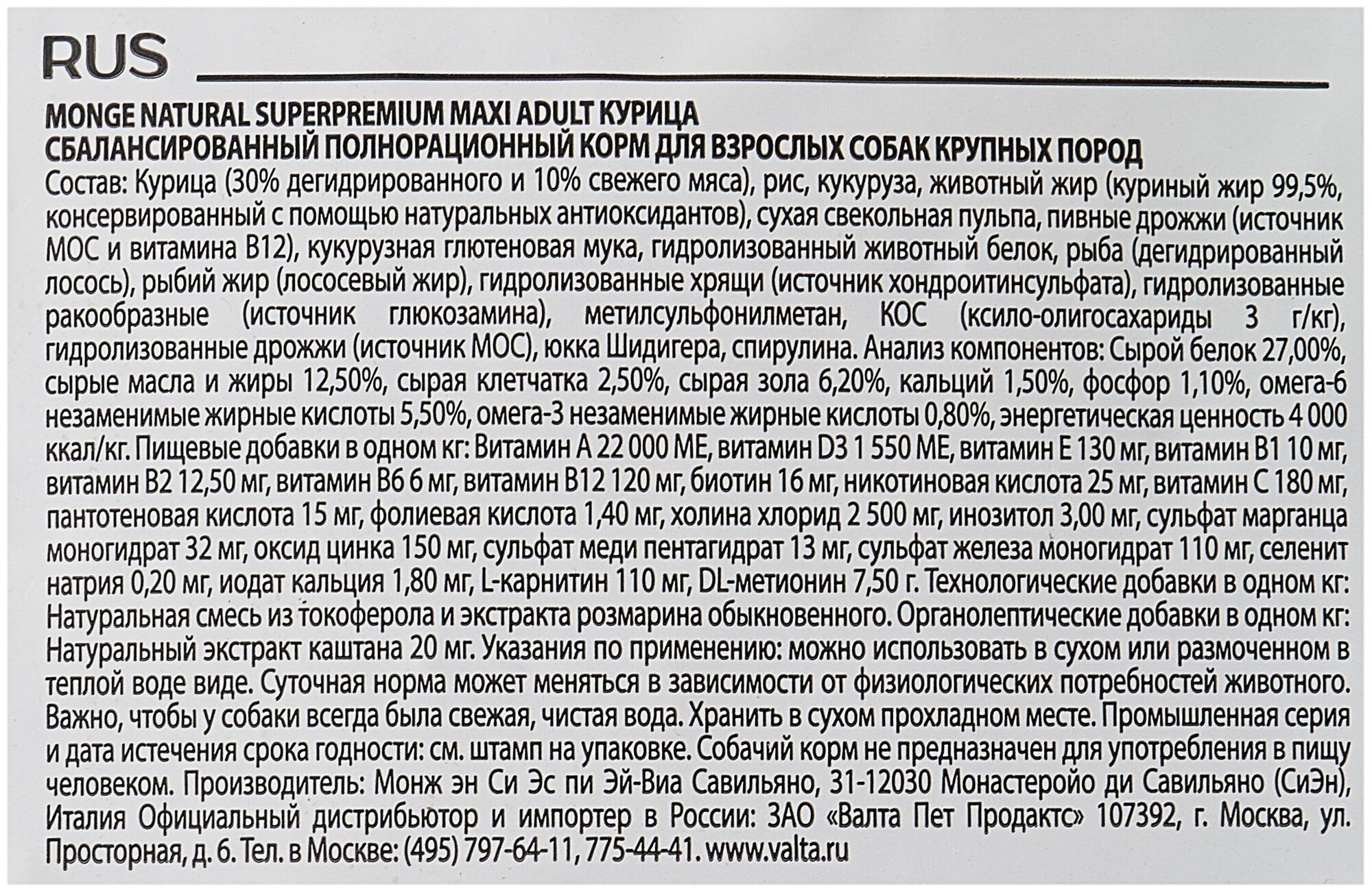 | Состав | Ингредиенты: курица (30% дегидрированного и 10% свежего мяса), рис, кукуруза, животный жир (куриный жир 99,5%, консервированный с помощью натуральных антиоксидантов), сухая свекольная пульпа, пивные дрожжи (источник МОС и витамина B12), кукурузная глютеновая мука, гидролизованный животный белок, рыба (дегидрированный лосось), рыбий жир (масло лосося), гидролизованные хрящи (источник хондроитина сульфата), гидролизованные ракообразные (источник глюкозамина), метилсульфонилметан, КОС (ксилоолигосахариды 3г/кг), гидролизованные дрожжи (источник МОС), юкка Шидигера, спирулина. |