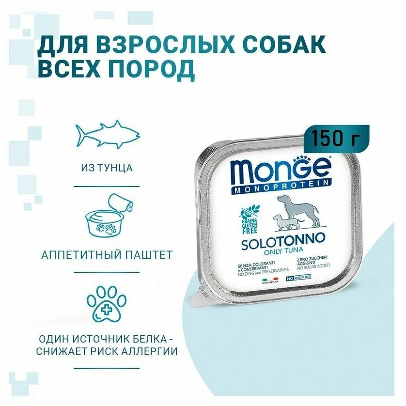 Влажный корм Monge Monoproteico для взрослых собак Solo консервы тунец 150г Dog Monoproteico Solo Tuna