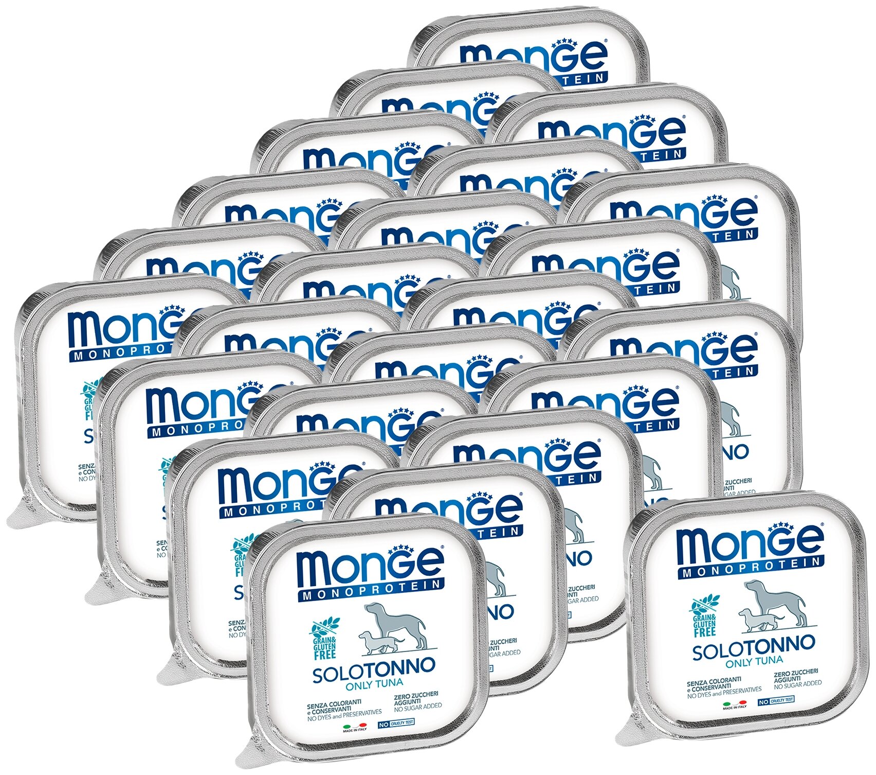 Паштет содержит только один источник белка животного происхождения и является сбалансированным питанием, подходящим для ежедневного кормления собак. Производится из отборного свежего мяса итальянского происхождения, которое соответствует стандартам качества, предъявляемым к производству продуктов питания для людей, в том числе детского питания. Отсутствие в составе красителей, консервантов, сахара и гидрогенезированных жиров подтверждает высокое качество продукции. Продукт произведен в Италии.Гарантированный анализ: сырой белок 11,5%, сырые масла и жиры 2%, сырая зола 1,7%, сырая клетчатка 0,5%, влажность 80%. Пищевые добавки/кг: витамин А 2500 МЕ, витамин D3 300 МЕ, витамин Е (альфа-токоферол 91%) 7 мг.Ингредиенты: свежее мясо тунца 100%, минеральные вещества, витамины. Технологические добавки: загустители и желеобразующие компоненты. Не содержит красителей, консервантов иглютена.Рекомендации по кормлению: собакам мелких пород необходимо ок. 400г продукта в день. Количество корма может варьироваться в зависимости от индивидуальных потребностей животного. Продукт подавать комнатной температуры или подогретым. ВАЖНО, чтобы животное всегда имело доступ к чистой, свежей воде. Открытую упаковку хранить в холодильнике.