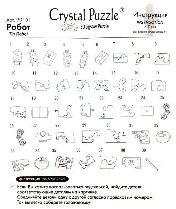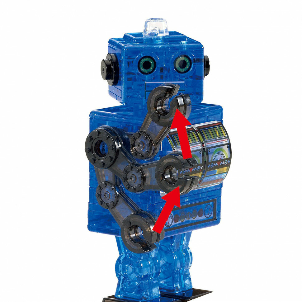 Этот симпатичный робот в ретро-стиле станет отличной игрушкой для ребенка или украшением интерьера. Соберите объемную головоломку из 3D-деталей, и у вас получится прочная фигурка с подвижными руками. Все детали сделаны из полупрозрачного пластика. Они прочно соединяются друг с другом и не рассыпаются. Головоломки серии Crystal Puzzle радуют интересным процессом сборки и хорошим результатом. Даже у новичка получится собрать свой первый 3D-пазл. Если возникнут трудности, то всегда можно обратиться за помощью к схеме-подсказке, которая есть в каждом наборе.