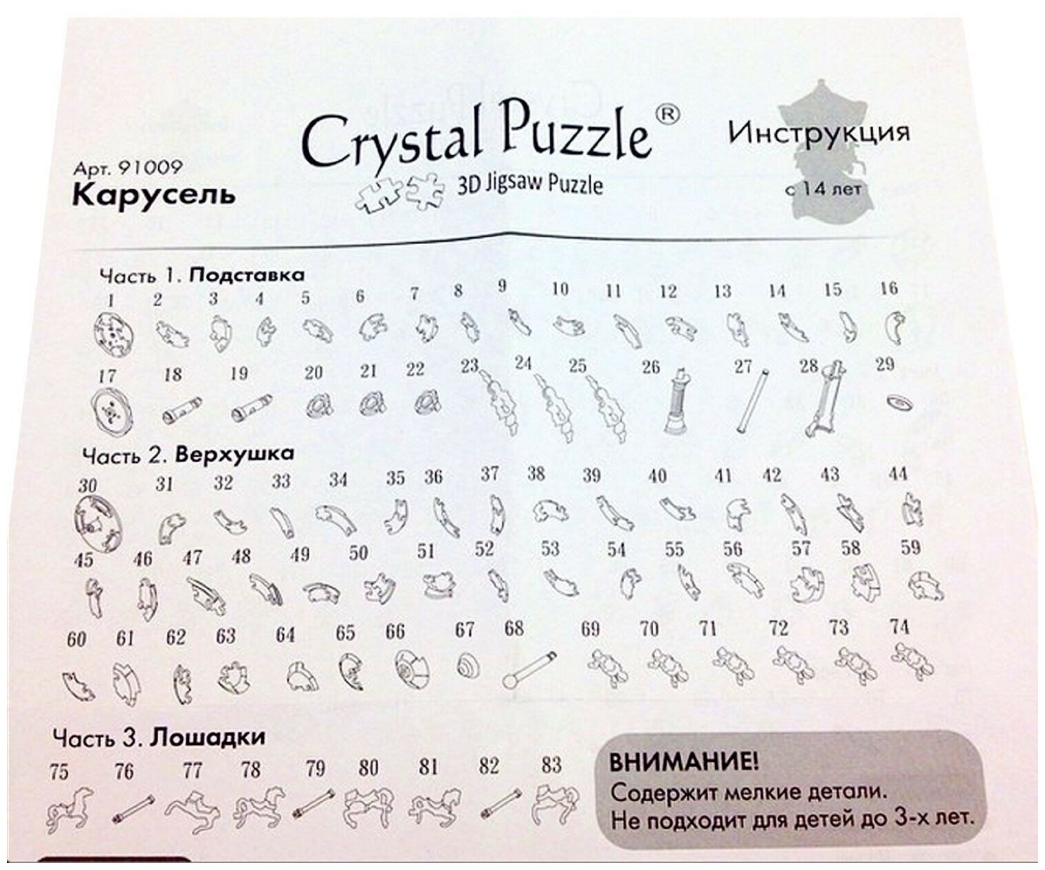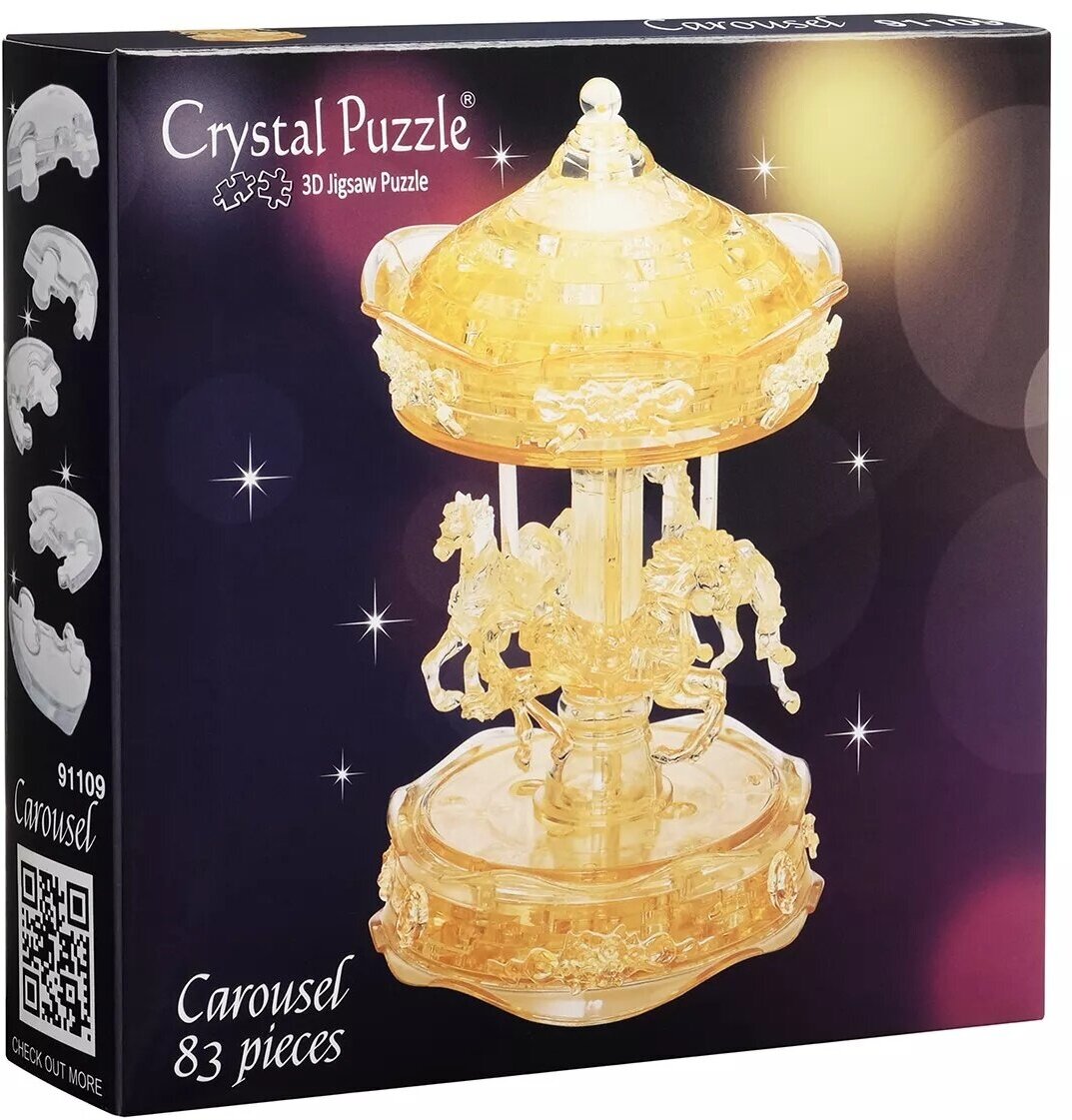 Одна из самых потрясающих головоломок из серии Crystal Puzzle – золотая карусель! Модель выполнена в стиле классических каруселей XIX века. Все детали переданы с точностью и любовью – от изящных лошадей в сбруе до винтажных вензелей на корпусе. Готовая карусель будет крутиться, лошадки пустятся с пляс, а вы сможете порадоваться своей работе. 3D-пазлы Crystal Puzzle – это самые удачные подарки для детей, так как они сочетают в себе полезное развлечение, улучшающее мышление и мелкую моторику, творчество и создание уникального сувенира. Взрослые любители пазлов оценят обширную линейку коллекционных моделей и их высокое качество.