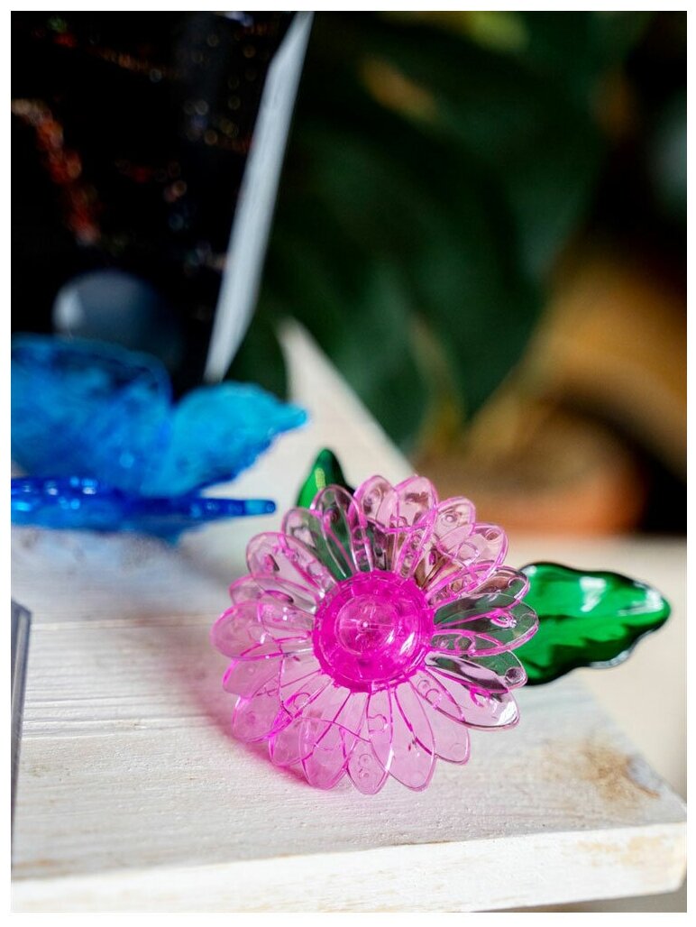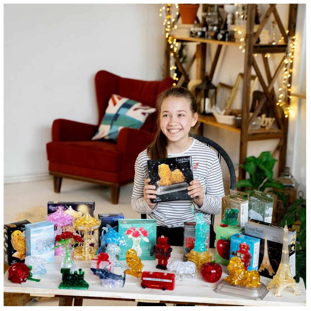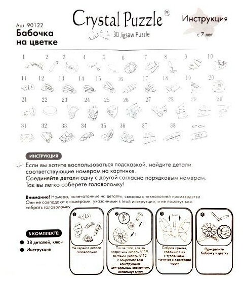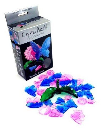 Необычная форма этого 3D-пазла заставит вас поломать голову. Изящная бабочка, состоящая из полупрозрачных деталей, сидит на цветке. Поначалу сложно понять, каким образом в этой композиции сохраняется равновесие. Но попробуйте собрать объемную фигурку по частям, и вы сами все поймете. Трехмерная головоломка состоит из фигурных деталей разных форм и размеров. Разноцветные элементы из гладкого пластика удобно держать в руках, и они прочно скрепляются друг с другом без клея. Готовая композиция получится очень крепкой и станет хорошим украшением интерьера или частью коллекции. Все модели из серии Crystal Puzzle прекрасно сочетаются друг с другом по стилю и размеру.