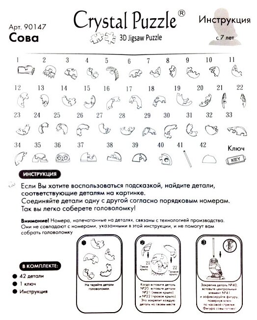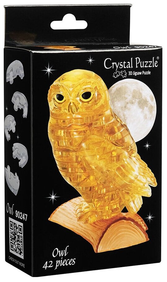 Сова – символ мудрости, знаний, твердости духа. Оказавшись на рабочем столе или на книжной полке в качестве сувенира, она напомнит о важности саморазвития и усердия. Подарите близкому человеку набор Crystal Puzzle, и он не только попробует себя в сборе необычного 3D-пазла, но и станет обладателем красивой фигурки. Сова поразит вас детализированным оперением и красивым янтарным оттенком. Фигурка собирается из объемных элементов, которые скрепляются без помощи клея и хорошо держатся вместе. 3D-пазл требует внимательности и способности мыслить за рамками привычного, поэтому он хорошо подходит для развивающих игр и тренировки мозга. Сложность ***