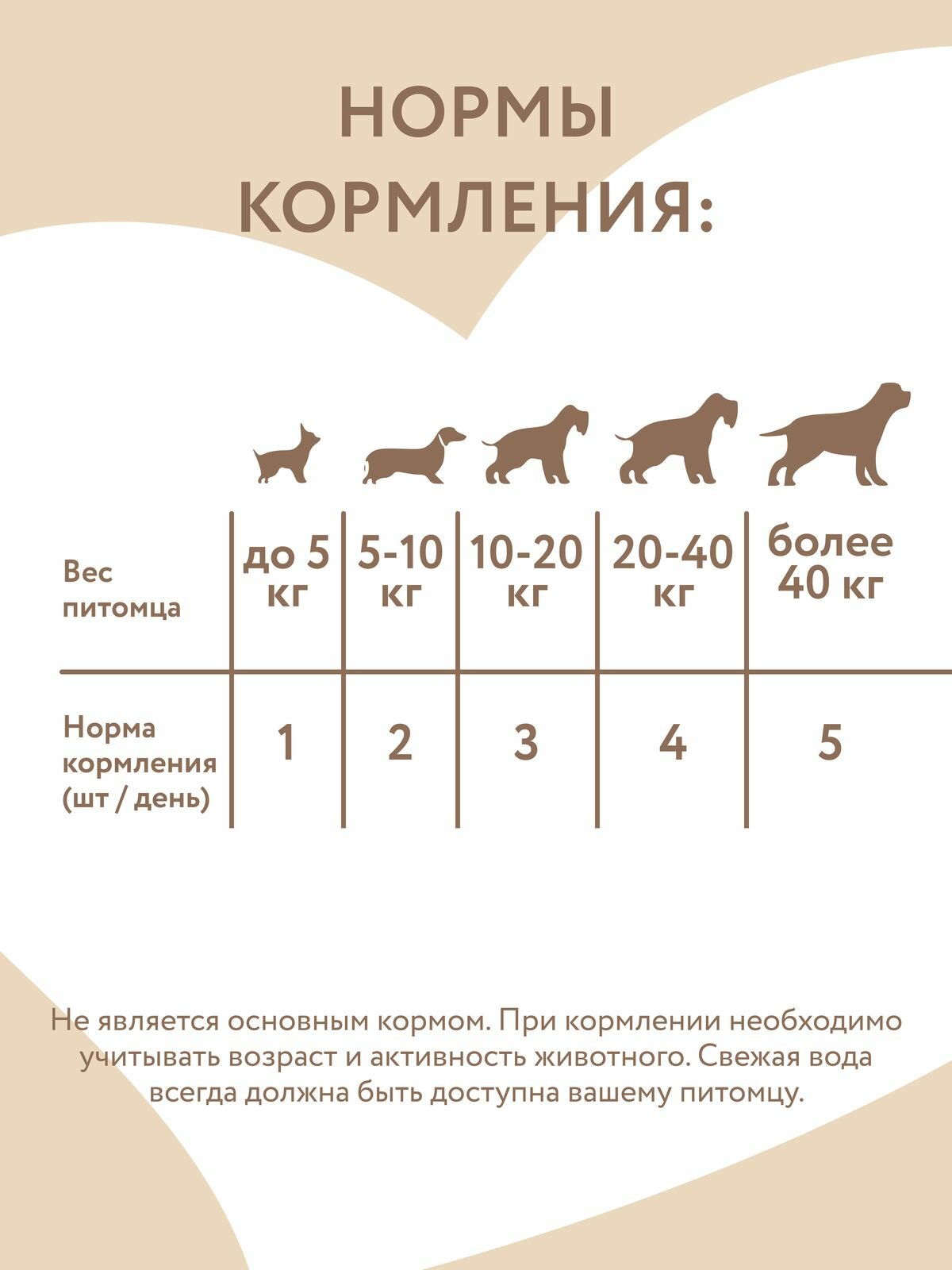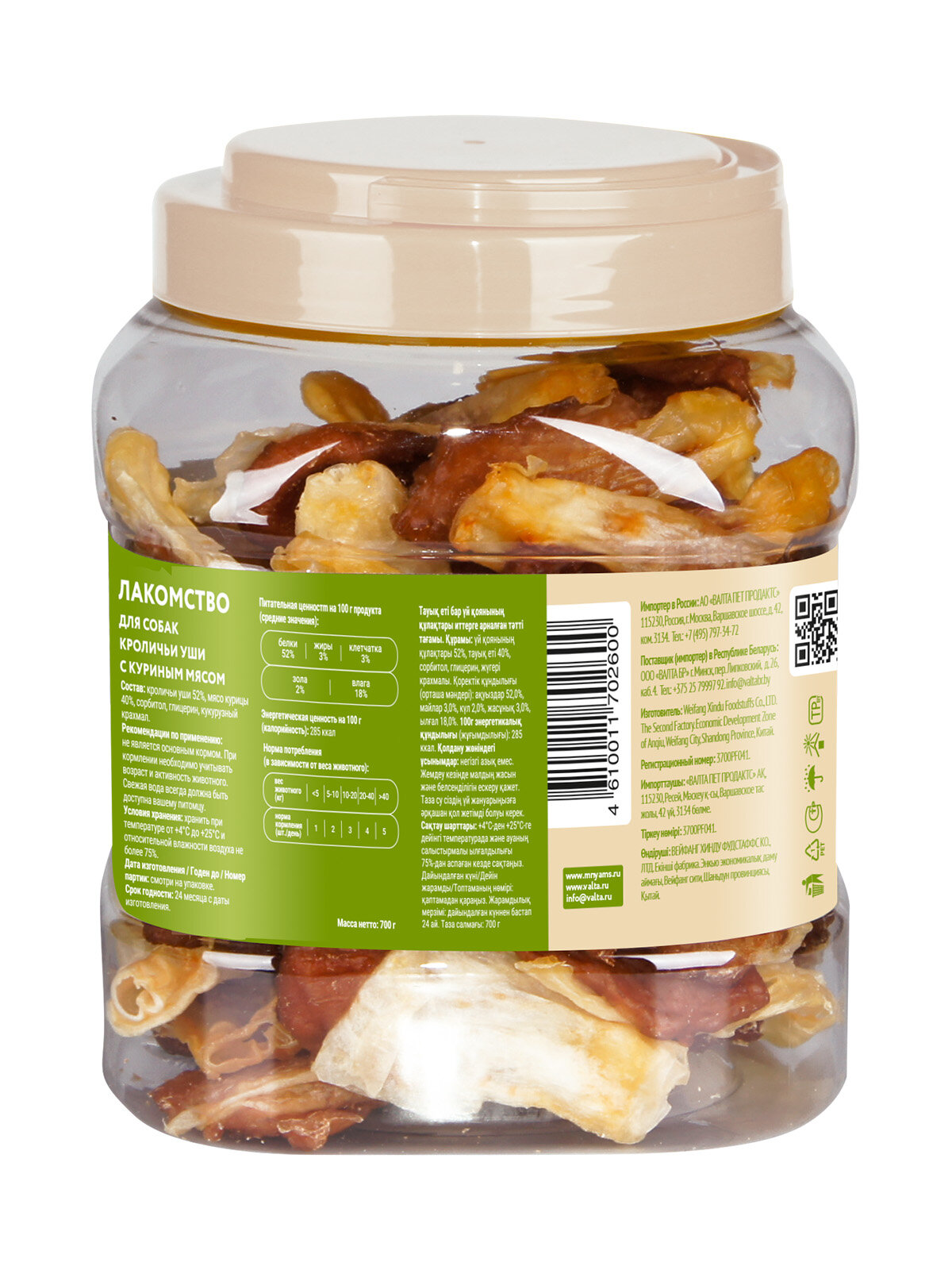 Натуральное лакомство для взрослых и растущих собак (с четырех месяцев). Кроличьи уши с куриным мясом Мнямс - это полезное диетическое лакомство, содержащее легкоусвояемый белок. Настоящий деликатес с вялеными ломтиками отборного филе не оставит равнодушным даже самого капризного любимца. При кормлении необходимо учитывать возраст и активность животного. Подходит для щенков с 4-х месяцев. Свежая вода всегда должна быть доступна вашему питомцу. Менее 5 кг - 1 ухо, 5-10 кг - 2 уха, 10-20 кг - 3 уха, 20-40 кг - 4 уха, Более 40 кг - 5 ушей.