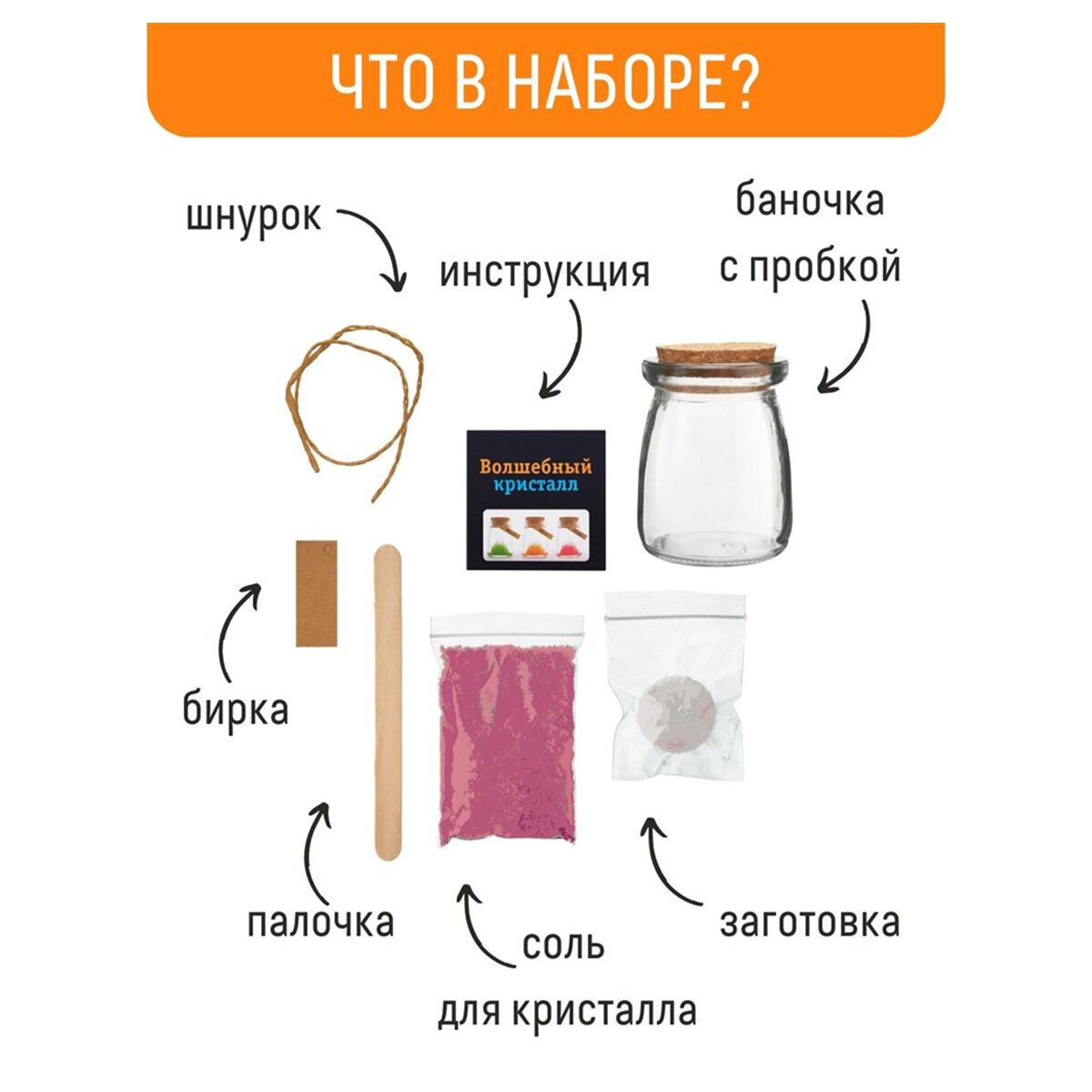 В каждом наборе из серии: красивая баночка, в которой удобно следить за выращиванием кристаллов, волшебный кристаллический порошок, кристаллическая таблетка, палочка для перемешивания, пробка, веревочка, карточка с пожеланием и инструкция. Информация на коробке - полностью на русском языке.