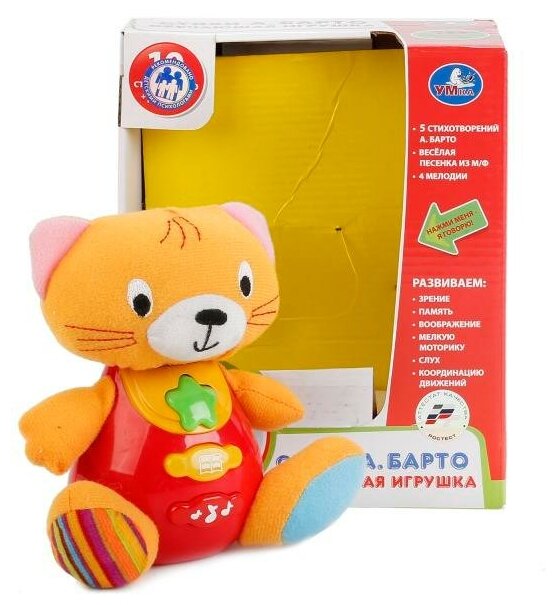 Обучающая игрушка Умка Кот предназначена для раннего развития. Встроенный звуковой модуль воспроизводит 4 мелодии, песенку из мультфильма и 5 стихотворений А. Барто. Корпус игрушки из пластика, а голова, руки и ноги кота мягкие. На теле 3 кнопки, при нажатии на которые включается звук. Игрушка рекомендована психологами и имеет 6 развивающих функций - тренирует зрение, память, воображение, слух, мелкую моторику и координацию движений. Качество подтверждено аттестатом Ростест. Рекомендовано детям от 6 мес.