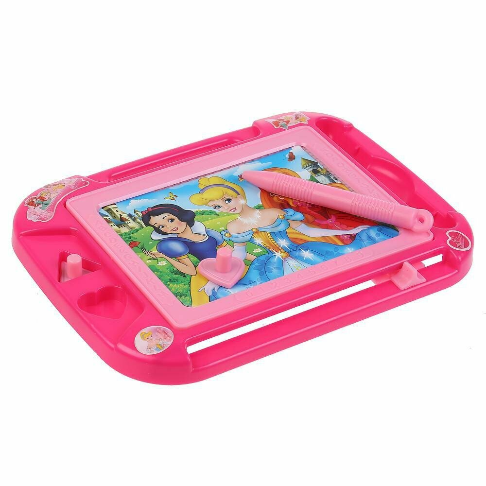 Магнитная доска Принцессы предназначена для рисования и развития творческих навыков ребёнка. Она выполнена в розовом цвете в виде чемоданчика с изображёнными на ней принцессами Дисней. У доски есть удобная ручка, поле для изображения, 2 магнитные печати, место для стика. Для рисования нужно использовать небольшую палочку, которая выводит чёрные контуры картинки на белом поле. Чтобы стереть изображение, необходимо использовать специальный рычажок снизу. Размер доски составляет 20*15 см.
