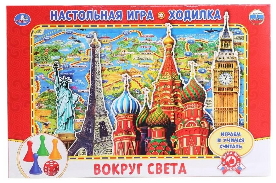 Настольная игра-ходилка Умка Вокруг света выполнена в стиле карты мира, поэтому игровое пространство заполнено разными достопримечательностями стран. В наборе предусмотрено яркое игровое поле с красочными иллюстрациями, кубик и фишки разных цветов (4 шт.). В игре могут принять участие от 1 до 4 детей. Задача каждого – кидая кубик, ходить свой фишкой вперед на выпавшее количество клеток. Победителем признается игрок, первый добравшийся до финиша. В процессе игры дети смогут научиться считать, совершая свой ход. Набор изготовлен из высококачественного пластика и плотного картона, которые абсолютно безопасны для детей и сертифицированы. Фишки и игровое поле окрашены яркими нетоксичными красителями, устойчивыми к истиранию и выгоранию. Рекомендовано детям от 3-х лет