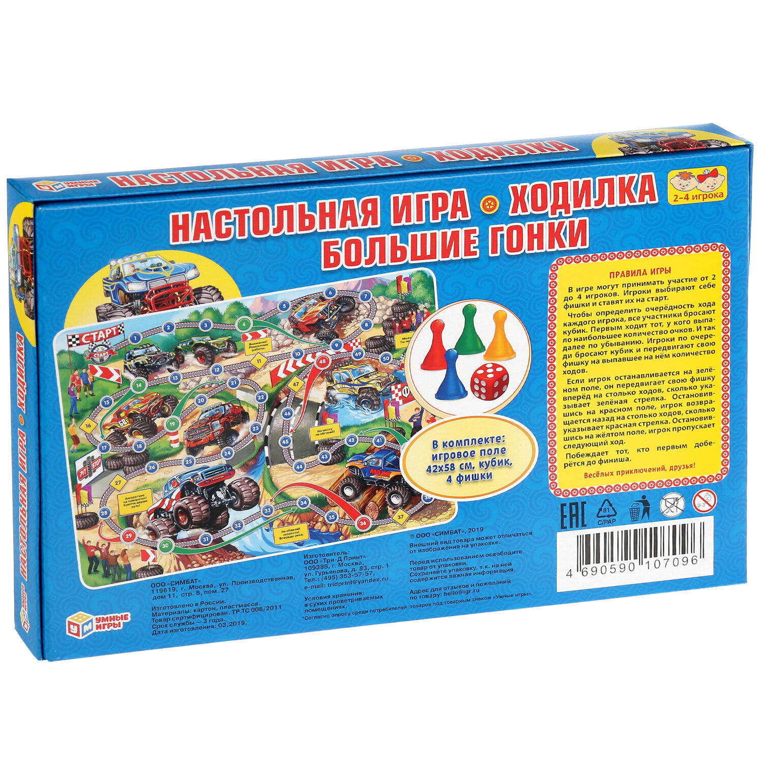 | Описание | Настольная игра "Большие гонки" от бренда "Умка", представляет собой игру-ходилку со стандартными правилами игр подобного типа. В игре могут участвовать от двух до четырех человек, каждый бросает игральные кости по очереди и делает ход фишкой своего цвета. Побеждает тот игрок, которые быстрее дойдет до финиша, преодолев все препятствия на своем пути. |