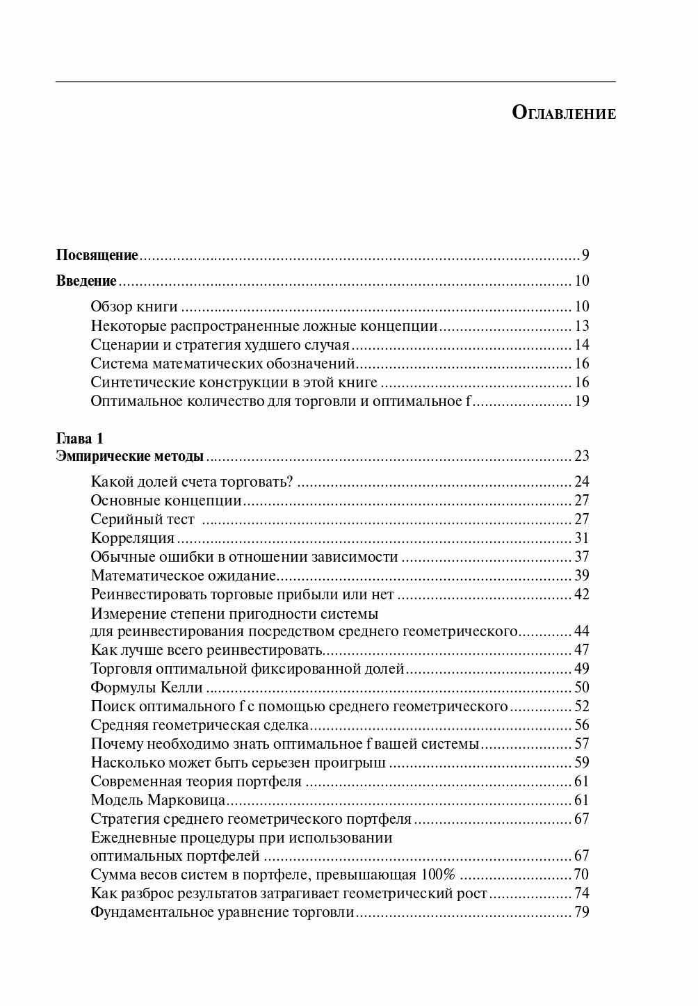 Прочитав оглавление, был в сильном предвкушении, ведь такие важные и насущные трейдерские вопросы там затронуты: объем входа, корреляция, усреднения, мат. ожидание... Но, увы, книга для меня стала большим разочарованием. Никаких особых практических советов тут и нет, заявленные темы вообще не раскрыты. Одна математическая теория, которая, просто уверен, для 99% трейдеров будет бесполезной. Гуманитарию эту книгу так и вовсе категорически не рекомендую читать. 70% содержания покажутся иероглифами с бесконечными формулами и расчетами. Все основные мысли и советы изложены на первых 150 страницах. А главное что можно подчерпнуть из этой книги - основная идея -это оптимальное f - статистически рассчитываемый параметр оптимальной доли объема входа в сделку для вашего депозита, для вашей торговой системы. Могу сэкономить вам прочтение этой книги, для среднестатистического трейдера, делающего 5-30 трейдов в месяц, не рискуйте в сделке более 2% от депозита, вот вам и вся математика управления капиталом. -