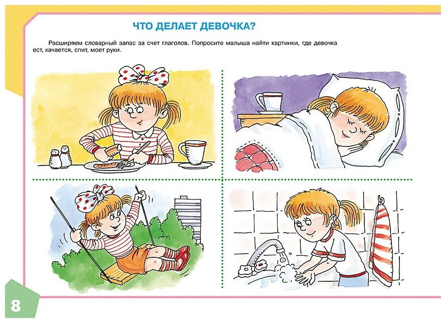 Книга замечательная! Множество заданий на развитие речи у ребёнка. При этом они разнообразные и интересные: пальчиковые игры со стихами, дыхательная, артикуляционная гимнастика, развитие общей моторики, звукоподражание, рассказ истории по картинке. Ребёнок учится внимательно смотреть на картинку и рассказывает то, что видит. Занятия идут от простых к сложным. В книге очень много картинок, напоминающих карточки Домана, где под рисунком написано слово. Мне вариант с книгой нравится больше (карточки то мнутся, то теряются, а в книге все на месте). Если с ребёнком регулярно заниматься, то результат будет обязательно. Рекомендую.