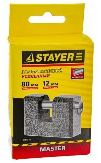 Навесной замок STAYER MASTER - инструмент для запирания помещений и предметов быта: шкафов, ящиков и т.д. Является надежной защитой имущества благодаря закаленной дужке и секретному механизму. На металлический корпус нанесено защитное покрытие, что позволяет использовать замок при любой погоде.