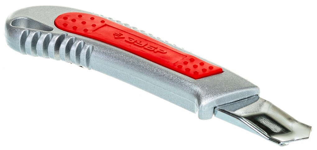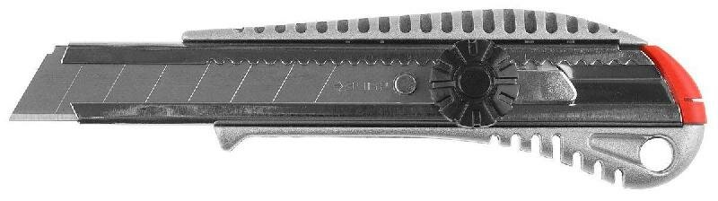 Нож с сегментированным лезвием ЗУБР Про-18А 18 мм 09170-Металлический корпус позволяет прикладывать значительный усилия при резе и обеспечивает максимальную надежность конструкции;-Автоматический фиксатор лезвия;-Лезвие изготовлено из легированной стали У8А с двойной заточкой;Профессиональный металлический нож применяется для разрезания различных материалов: линолеума, ковровых покрытий, гипсолитовых плит, гипсокартона, кровельных материалов, пластика, дерева и т. д.-Ширина лезвия: 18 мм-Тип лезвия: Сегментированное -Материал лезвия: сталь У8А -Тип фиксатора: Автостоп -Материал корпуса: МеталлическийШирина лезвия - 18 ммнож ; Канцелярский нож ; Строительный нож ; выдвижной нож ; Нож с выдвижным лезвием ; Нож с сегментированным лезвием ; нож с отламывающимся лезвием ; Нож с выдвижным сегментированным лезвием ; Строительные ножи ; Ножи с сегментированным лезвием