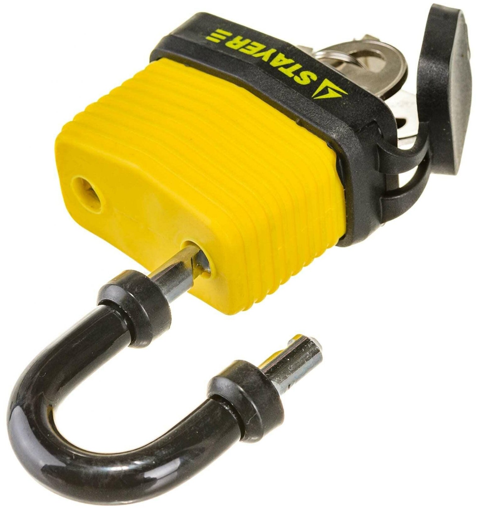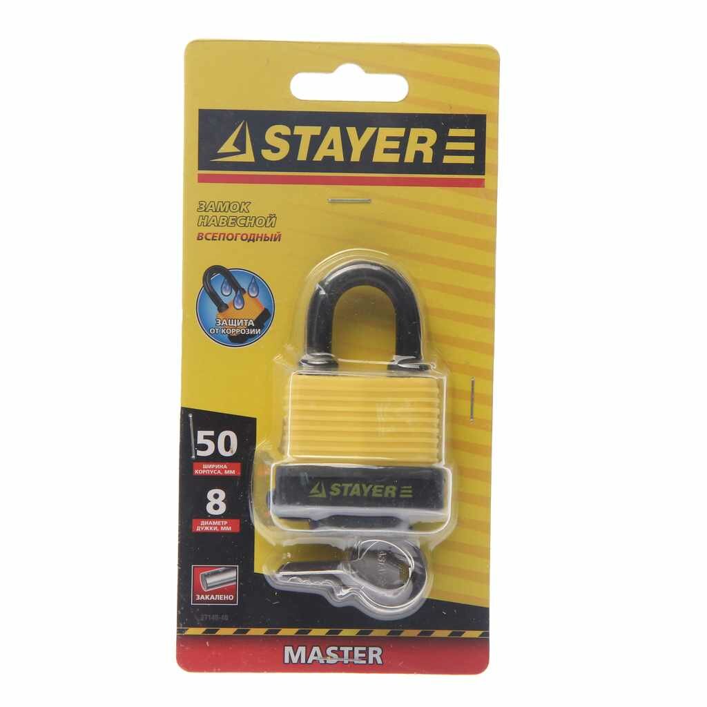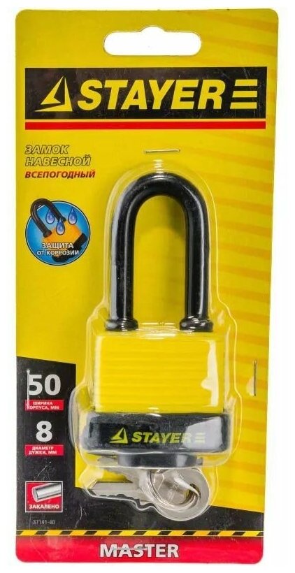 | Прочие особенности и свойства | Навесные всепогодные замки STAYER – надежная защита вашего имущества в любых погодных условиях. Корпус в пластиковом кожухе; Дужка замка защищена резиновым чехлом; Цилиндр изготовлен из латуни; Закаленная дужка из высококачественной стали. |