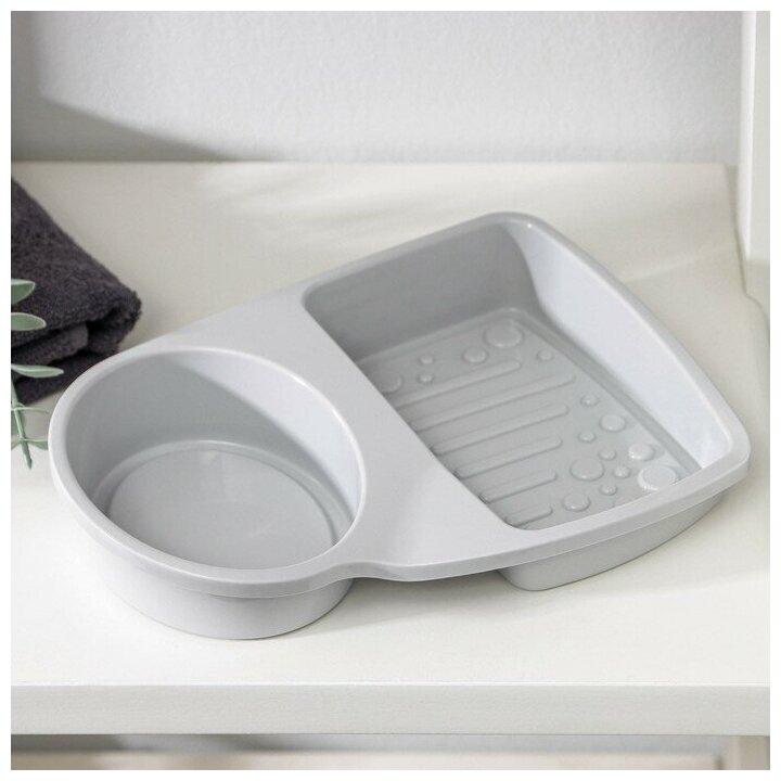 Подставка имеет два отделения: для моющего средства и для губки. Помогает поддерживать чистоту и порядок на кухне и ванной комнате. Имеет компактные размеры. Подставку можно мыть в посудомоечной машине.