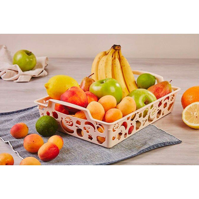Поднос с ручками предназначен для хранения и переноски фруктов и овощей, которые не рекомендуется хранить в холодильнике: бананы, лимоны, лаймы, мандарины, помидоры, авокадо и др. Удобные прочные ручки позволяют без труда переносить поднос. Благодаря высоким бортикам изделие можно использовать как поднос и как корзинку. Подносы изготавливаются из безопасного полипропилена, пригодного для контакта с пищевыми продуктами. Подносы хорошо штабелируются.
