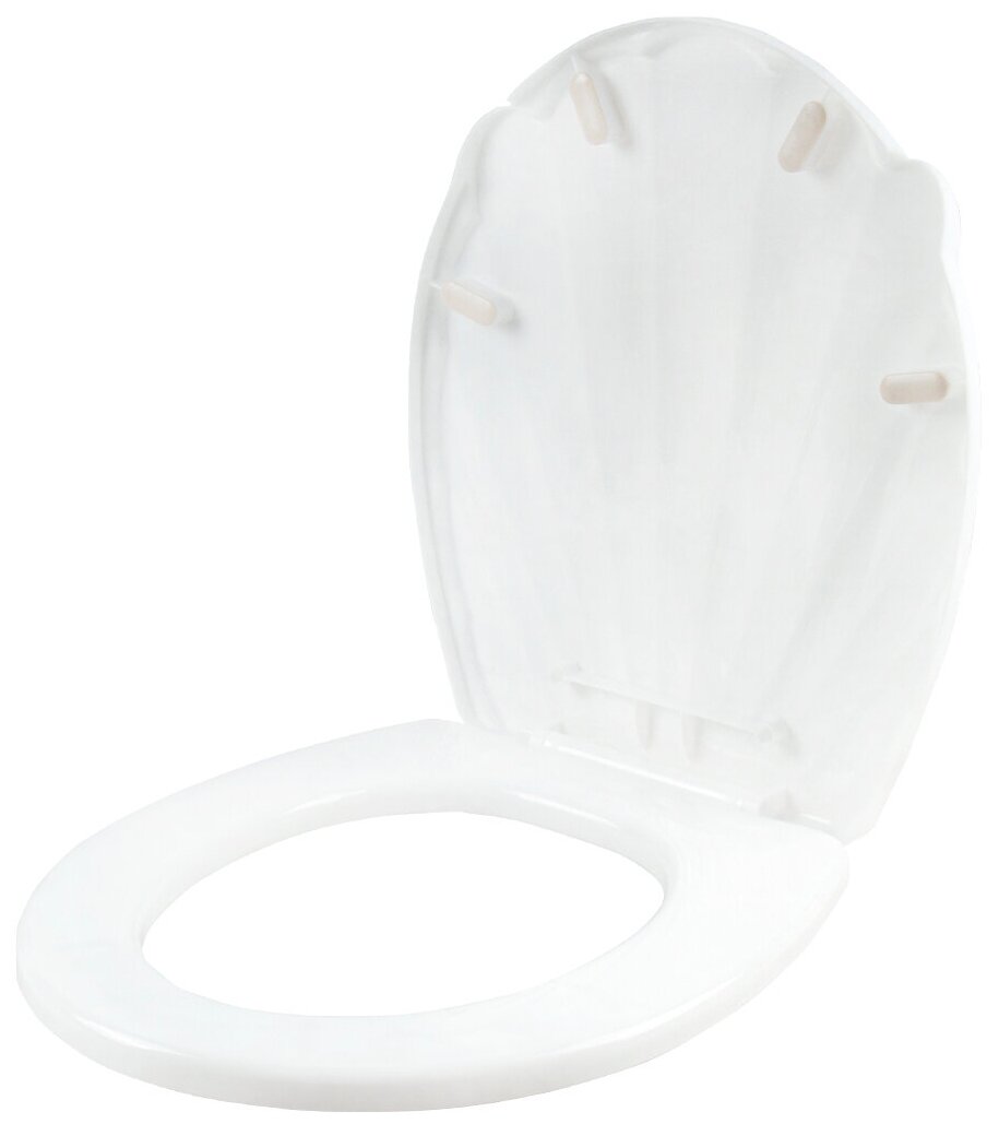 Универсальное сиденье на унитаз с крышкой в виде ракушки. Надежно крепится к унитазу. Изготовлено из прочного пластика.