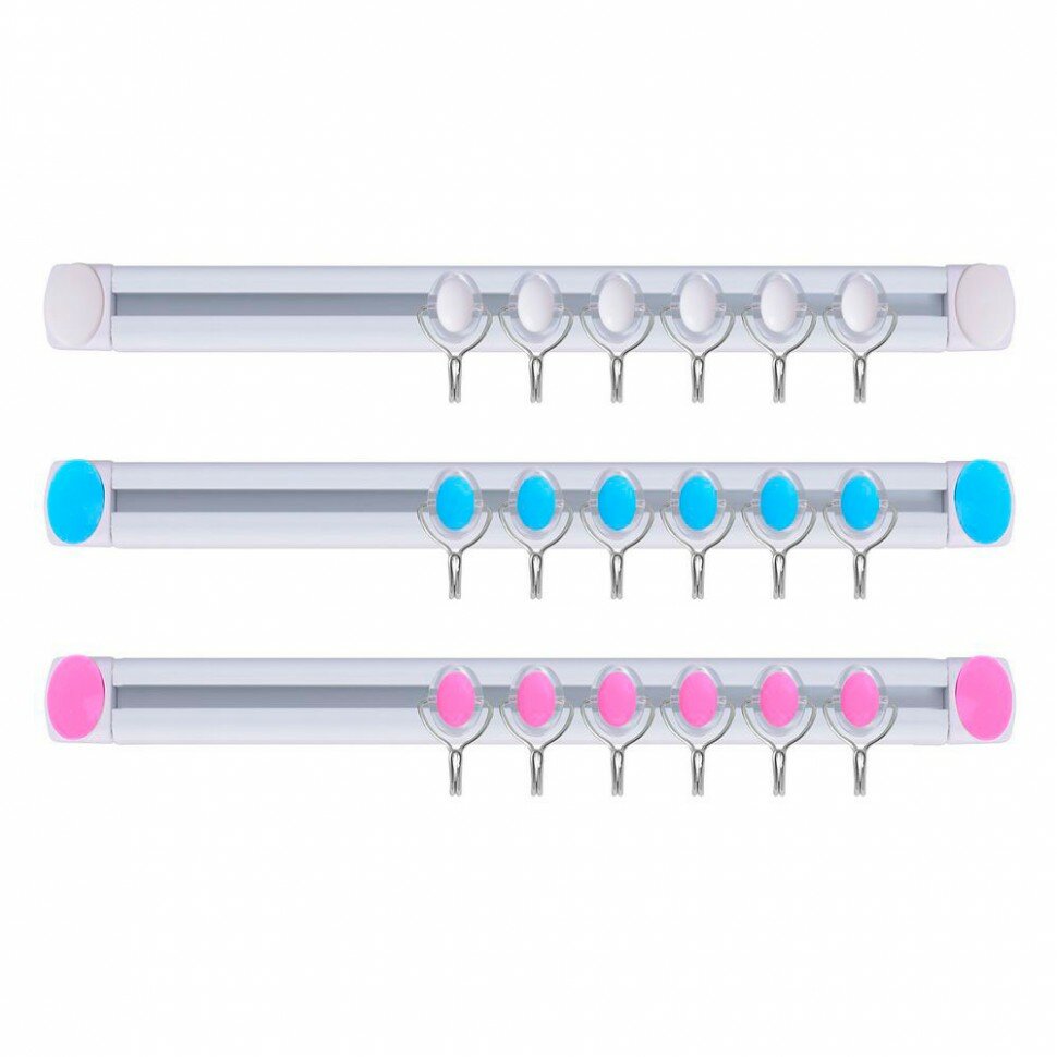 Позволяют развесить на стенах и дверях кухни, ванной или прихожей необходимые принадлежности. Благодаря подвижному креплению крючков на стержне можно менять расстояние между ними и свободно развесить на одной планке предметы различных конфигураций и габаритов. Самоклеящаяся пленка на тыльной стороне базовых оснований изделия обеспечивает надежность его крепления к любой гладкой поверхности. Изготовлено: основание и декоративные элементы из пластмассы (полипропилен), крючки из стальной хромированной проволоки и пластмассы. Длина планки 35 см. В комплект входит: планка с к6 крючками-1 шт., шурупы-2 шт. Не превышать максимальную нагрузку, указанную на этикетке-2,5 кг.