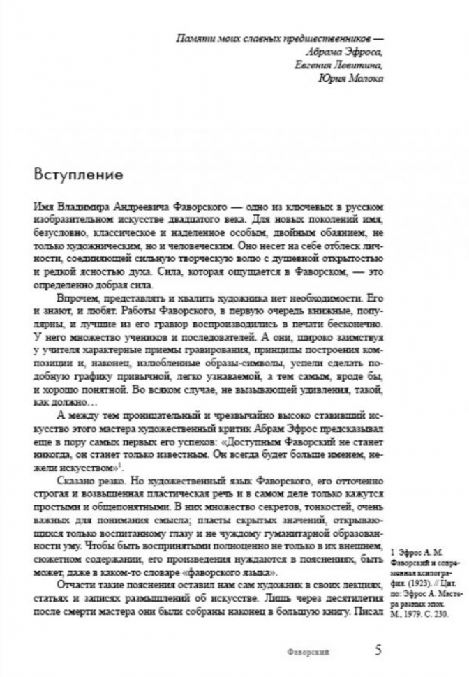 Книга станет "Путеводителем по Фаворскому", введением в художественный мир этого глубокого мастера станет эта книга. В издании не только описаны основные этапы и обстоятельства его жизни и творчества, показаны наиболее интересные работы, но и обозначена их роль в общем развитии искусства. Прослежены связи с явлениями культуры и общественной жизни (современными в ту пору, или уже историческими). Имя Владимира Андреевича Фаворского - одно из ключевых в русском изобразительном искусстве двадцатого века. Для новых поколений имя, безусловно, классическое и наделенное особым, двойным обаянием, не только художническим, но и человеческим. Оно несет на себе отблеск личности, соединяющей сильную творческую волю с душевной открытостью и редкой ясностью духа. Сила, которая ощущается в Фаворском, это определенно добрая сила. Впрочем, представлять и хвалить художника нет необходимости. Его и знают, и любят. Работы Фаворского, в первую очередь книжные, популярны и лучшие из его гравюр воспроизводились в печати бесконечно. Книга - целостный творческий портрет выдающегося художника. Она сосредоточена на нескольких, еще не получивших, исчерпывающего разрешения вопросах, принципиальных для понимания содержания и характера его работы в искусстве. Главный из них - это проблема единства художественного творчества выдающегося мастера, реформатора искусства книги и деревянной гравюры и разрабатывавшейся им фундаментальной художественной теории. Автор работы Юрий Яковлевич Герчук - известный искусствовед, художественный критик, заслуженный деятель искусств Российской Федерации. Ю. Я. Герчук был лично знаком с Фаворским. Работа "фаворский" является последним научным трудом Юрия Яковлевича. В ней рассмотрено творчество Фаворского в таких областях как: Графика. Искусство книги. Иллюстрация. Ксилография. Рисунок. Шрифт. Композиция. Изобразительное пространство. Художественная цельность. Синтез искусств. Стиль. Символ.